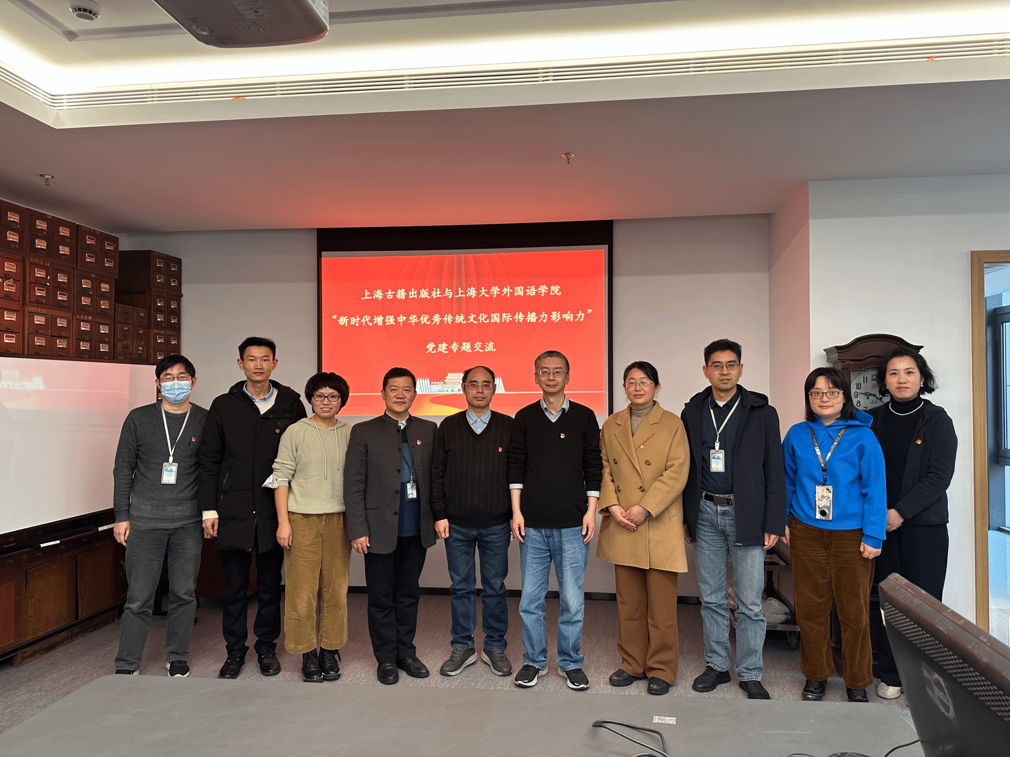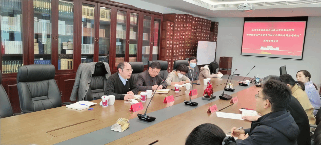 12月12日下午2点,上海大学外国语学院党委一行在党委书记邓志勇教授,党委副书记、院长尚新教授带领下赴上海古籍出版社开展“新时代增强中华优秀传统文化国际传播力影响力”党建专题交流活动。外国语学院党委一行受到了上海古籍出版社领导的热情接待,会议由古籍出版社党委副书记、总编辑奚彤云主持。