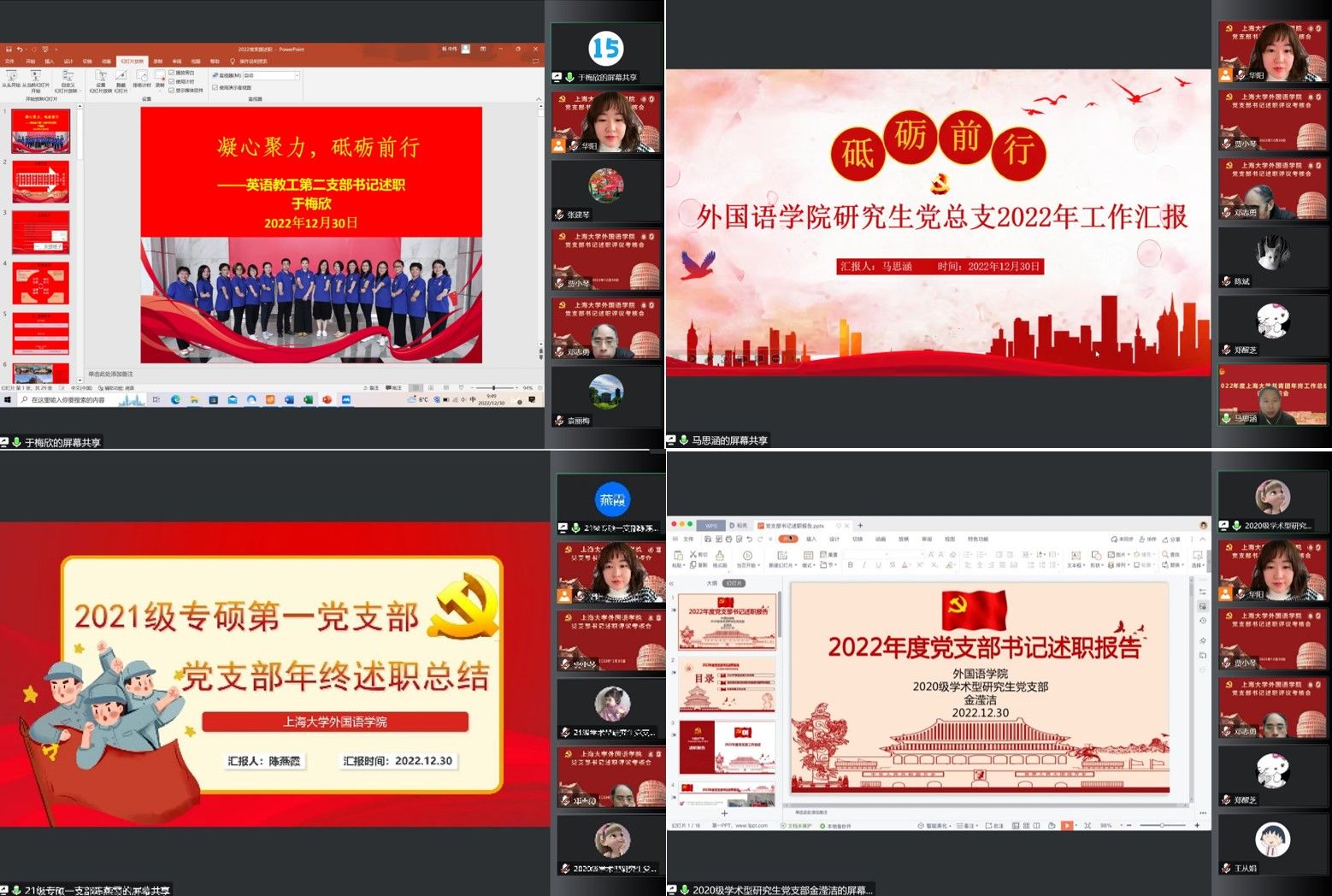 为深入学习贯彻习近平新时代中国特色社会主义思想和党的二十大精神,进一步加强学院党建工作、层层压实管党治党主体责任,12月30日上午9:30,外国语学院党委通过腾讯会议召开2022年党支部书记抓基层党建工作述职评议会。学院党委书记邓志勇,党委副书记、院长尚新,党委副书记、副院长贾小琴,副院长戴朝晖出席了本次述职会,学院教工、研究生、本科共2个党总支、13个党支部书记参加了述职。