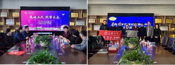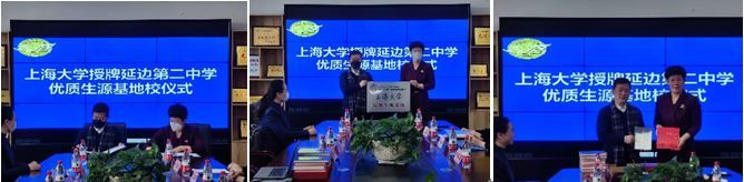 尚新院长与延边第二中学副校长王延芳代表双方学校共同签署《上海大学“优秀生源基地”合作协议》,并为优质生源基地揭牌;尚院长向延边二中赠送《百年上大》画卷和外国语学院赵彦春教授的“国学经典英译系列”书目。