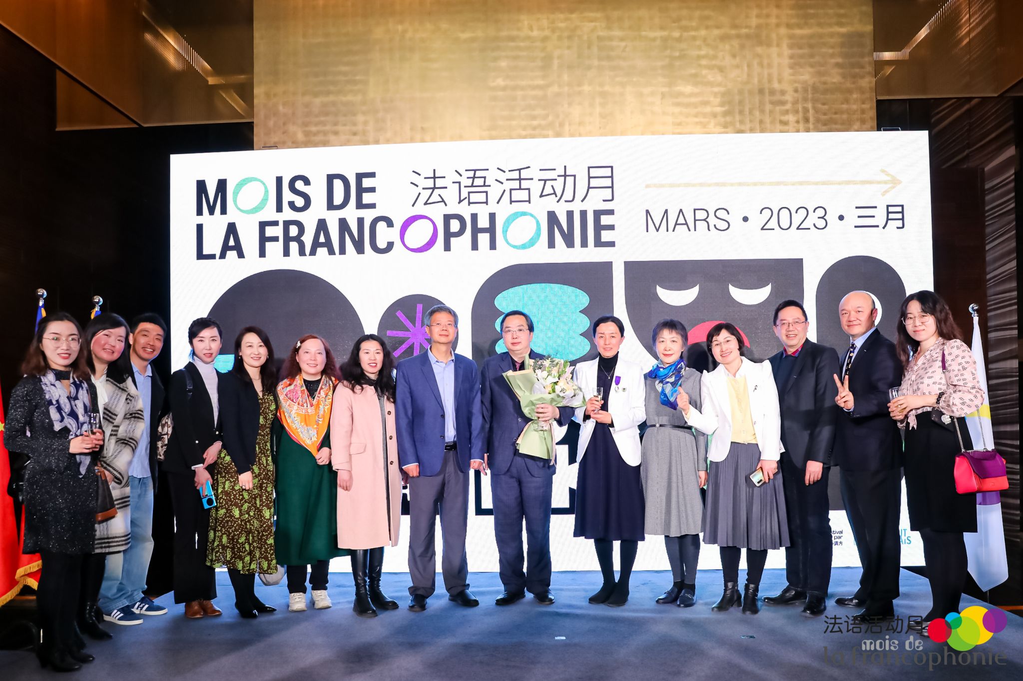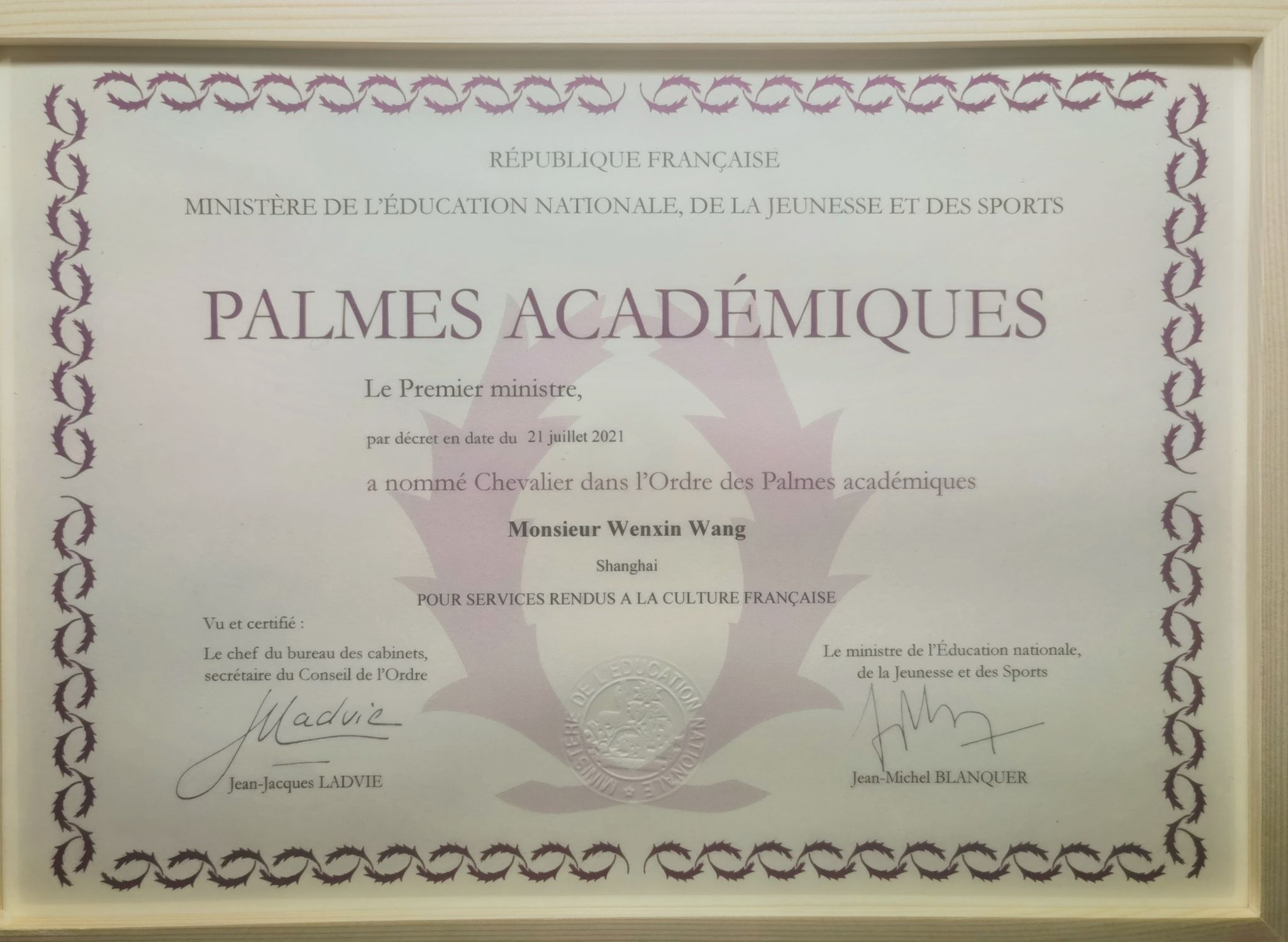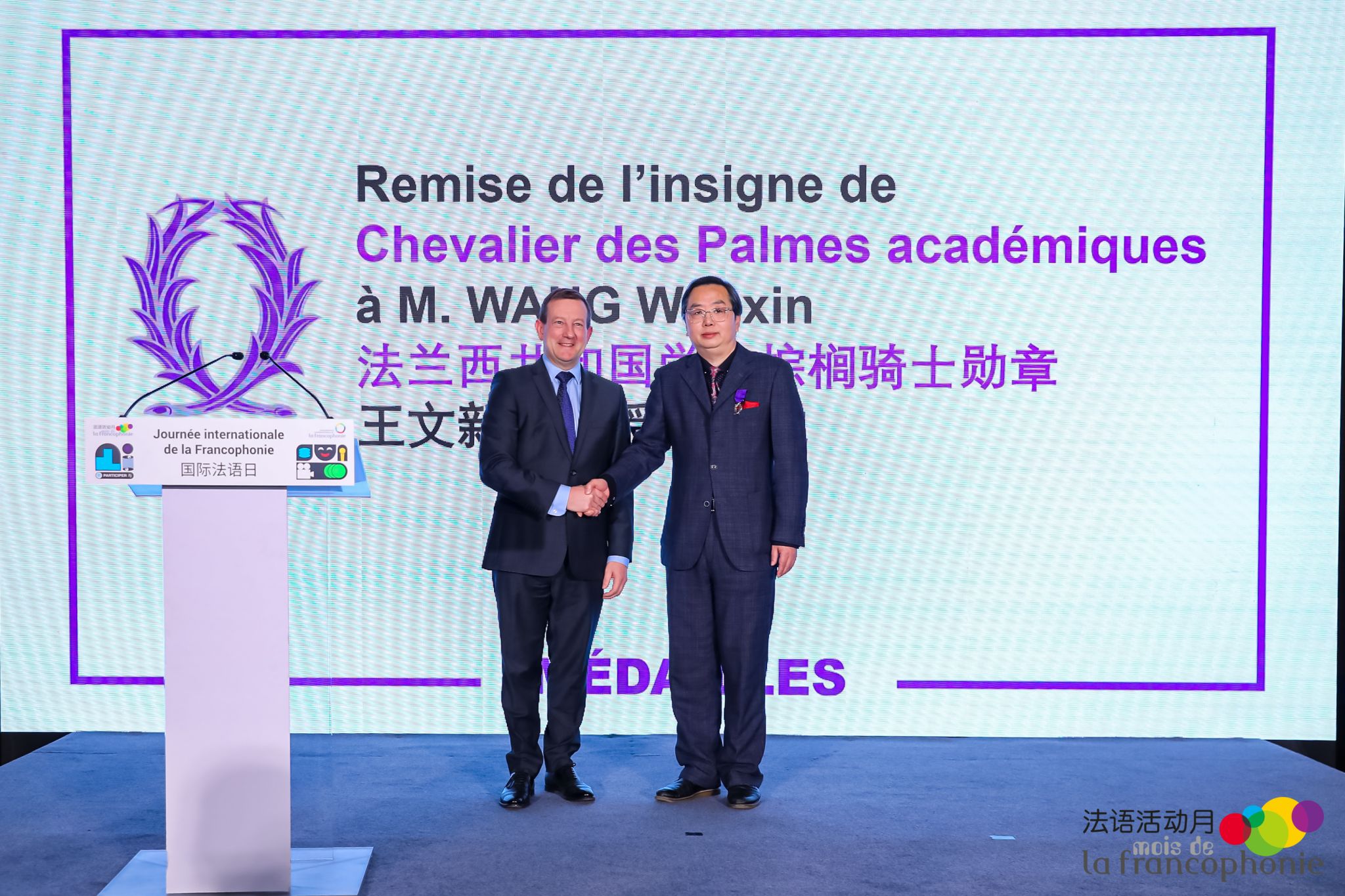 2023年3月20日晚,在庆祝新一年度国际法语日暨法语活动月之际,法国新任驻华大使白玉堂先生(S.E.M. Bertrand Lortholary)代表法国政府,在北京官邸为上海大学外国语学院王文新教授颁发法兰西共和国学术棕榈骑士勋章。法国驻华使领馆主要官员、在华十四所法语联盟(AF)校长、法语国家和地区数十位驻华大使或代表、全国部分法语专业院系负责人共计260多位嘉宾参加。我国教育部国际合作与交流司方军副司长亦代表教育部出席活动并发表讲话。