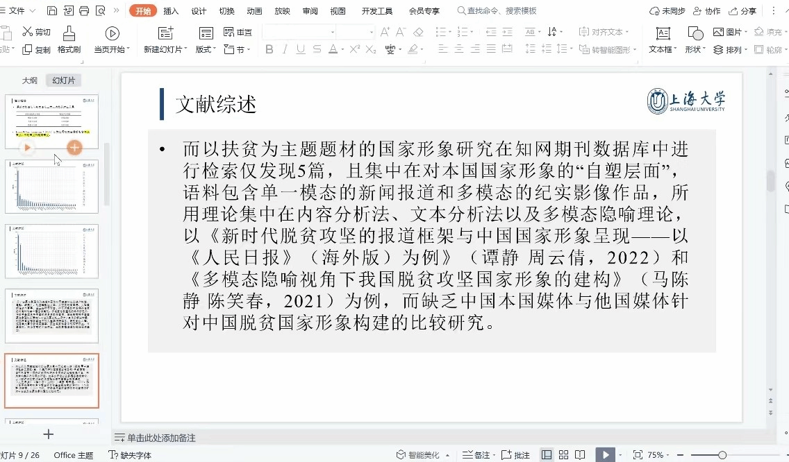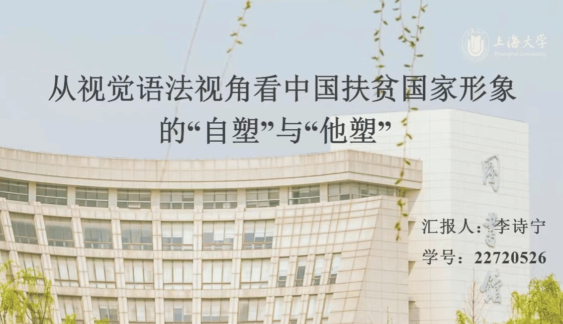 第二位主讲人为2022级研究生李诗宁。李同学的题目是《从视觉语法视角看中国扶贫国家形象的“自塑”与“他塑”》。她以Kress和Van Leeuwen的视觉语法为理论框架,从多模态话语的再现意义、互动意义、构图意义出发,对比分析了以扶贫为主题的我国官方媒体和外媒纪录片所建构的中国国家形象,为今后我国官媒在国际传播中进行纪录片创作和传播层面探寻相应路径,为深入解读“讲好中国故事”提供了参照。唐青叶教授提出国际传播应注意受众问题,就扶贫国家形象问题,李同学应深入挖掘外媒报道话语背后的动机以及深层意义,并可以在综述加入现有对中国扶贫形象的研究。张新玲教授肯定了李同学的报告思路,报告中有对国家国情的了解,语言学的理论的积淀和学以致用的态度,展现了语言学学科研究国际文化传播的意义。