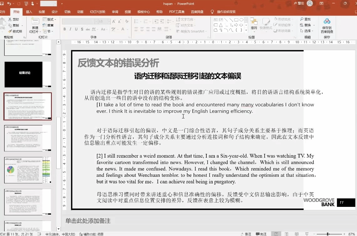 第四位主讲人为2020级本科生卢慧佳。卢同学的选题是《基于Buddy Reading Program非英语专业学生阅读反馈的文本分析》,她以上海大学非英语专业学生为目标群体的Buddy Reading Program案例,主要考察反馈者由语内迁移、语际迁移和交际策略引起的语言偏误,以及语言表述中描述性、表达性和诱发性等语言使用特点,分析聚焦中国学生文本反馈素养的内涵特质,探求中国学生在发展反馈素养、自我修正和提升的可行路径。唐青叶教授和张颖副教授肯定了本科生积极参与学术研究的精神,认为本报告对英汉对比研究有了较深刻的认识。同时,张新玲教授建议,该同学在系统性的知识掌握方面可以更进一步。
