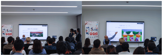 随后,日语系坂本秀幸老师从自身的教育背景出发,回顾自己学生时期来到中国交换学习的有趣经历,表达了对于本次中日文化交流会的热忱期待。接着,坂本老师从特产、特色美景、日语发音等多个角度,向大家介绍了自己的家乡千叶县,让同学们对于千叶有了更加具像化的了解。