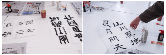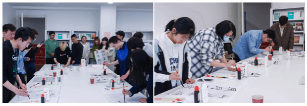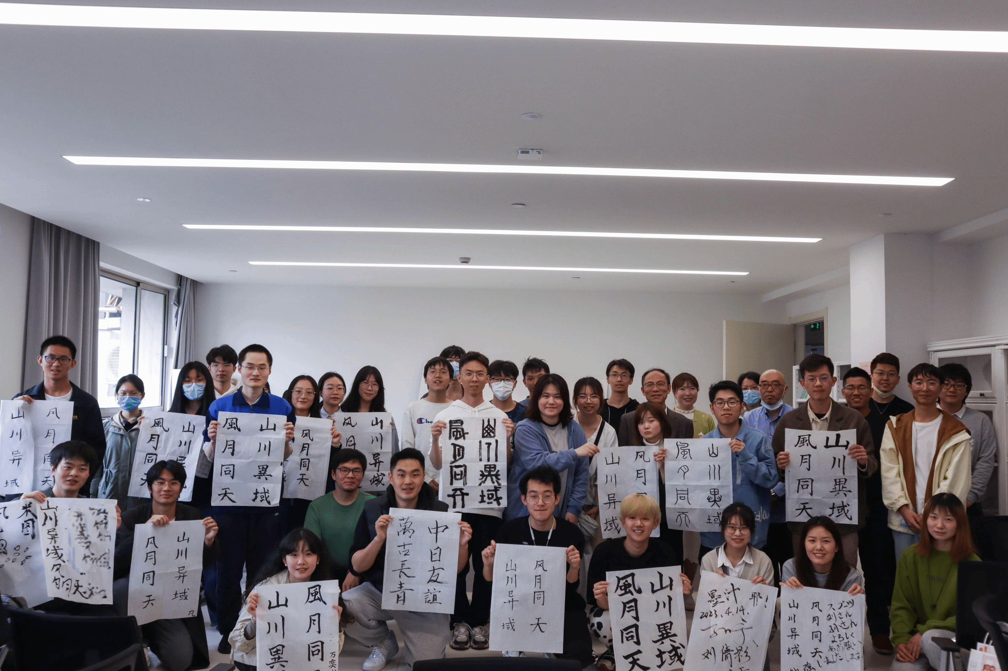 最后大家开展了书法体验环节,同学们都积极尝试书写了本次交流会的主题“山川异域,风雨同天”八个字,也有同学在此基础上加上了自己的创意理解。同时,大家也在书法体验环节主动与日本留学生和老师积极交流,了解多元文化,锻炼日语表达。大家还手握自己的书法作品进行合影留念。