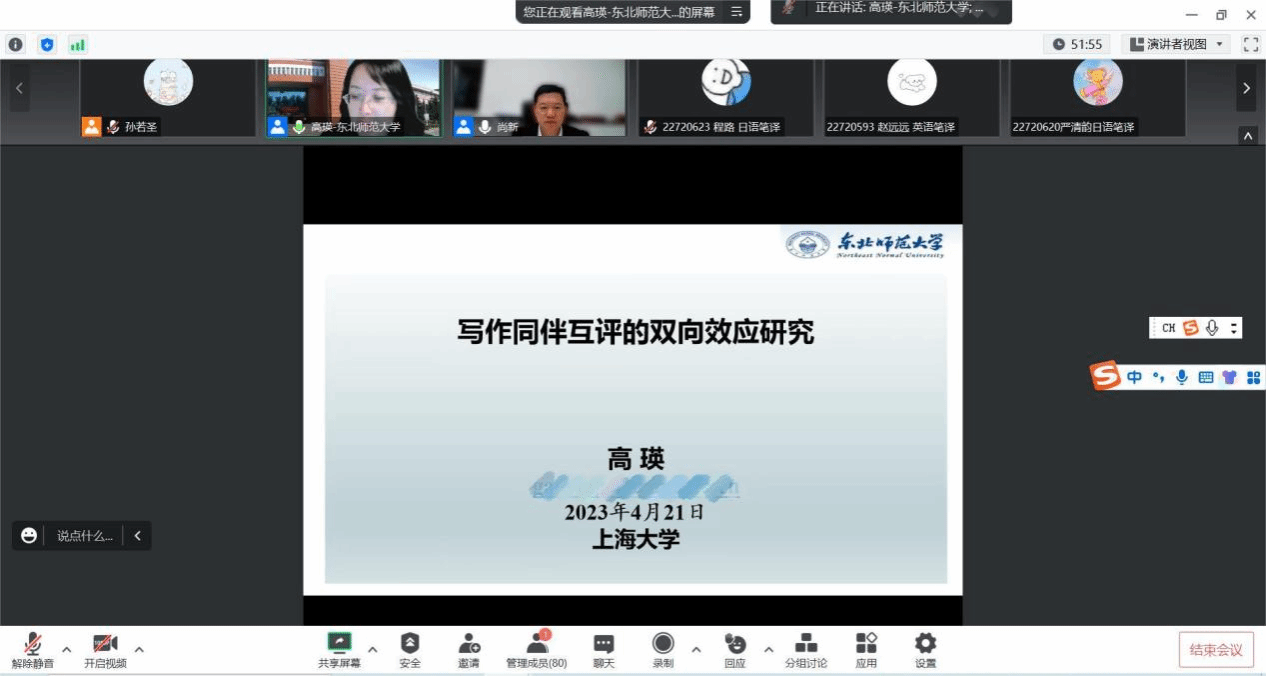 4月21日晚,东北师范大学高瑛教授应邀为外国语学院师生开设题为“写作同伴互评的双向效应研究”的线上讲座。讲座由院长尚新教授主持,学院百余名师生参加了本次讲座。