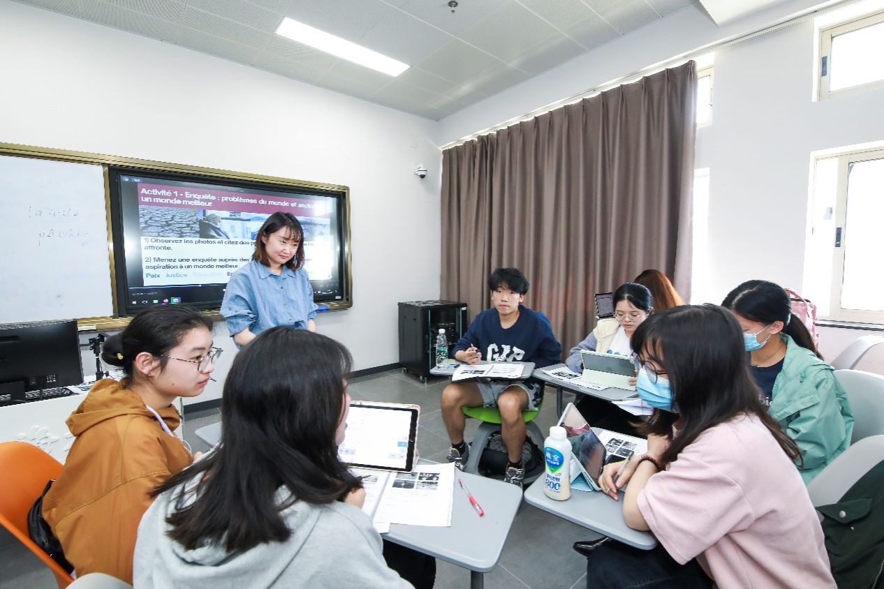 5月23日下午三点,外国语学院法语系青年教师焦舒曼老师在B426开讲《法国媒体与社会》课程思政公开课。本次课程主题为“人类命运共同体与美好世界”,课程选用《法语演讲教程》,这是外研社“理解当代中国”法语系列教材之一。上海大学教务部副部长、教育部课程思政教学研究示范中心负责人(上海大学)顾晓英,教务部课程思政教学研究中心曹园园,外国语学院党委书记吴蔚,副院长戴朝晖,法语系主任王文新,法语系教师王嘉源以及日语系教师张晓娜等观摩了公开课。