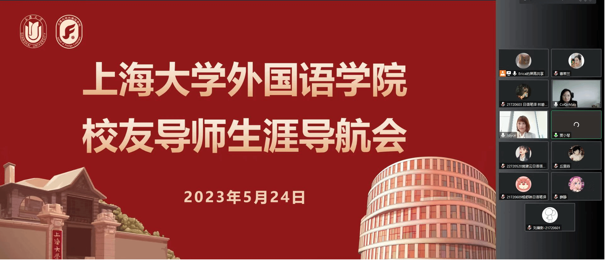 为了帮助应届生应对就业过程中所遇到的困难,5月24日上午,外国语学院线上顺利举办校友导师生涯导航会。上汽国际人力资源部执行总监毛天玲、浦发银行信用卡中心人力资源部副总经理袁美蓉等学院校友导师应“星海”生涯工作室邀请,线上为同学们答疑解惑,外国语学院党委副书记、副院长贾小琴,2021级研究生辅导员曹若兰,2023届毕业生参与了此次导航会。会议由2021级英语笔译研究生王甜同学主持。