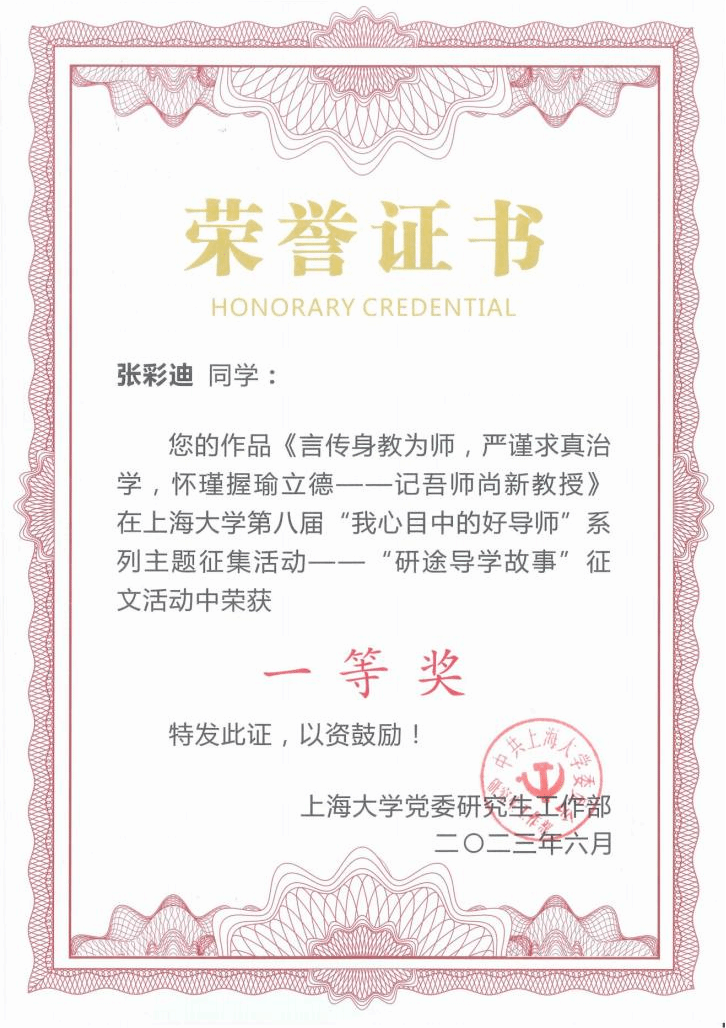 日前,上海大学党委研究生工作部、研究生院、党委教师工作部主办的上海大学第八届“我心目中的好导师”主题征文活动中,我院博士研究生张彩迪作品《言传身教为师,严谨求真治学,怀瑾握瑜立德————记吾师尚新教授》获得一等奖荣誉,展现了我院研究生与导师的在日常学术活动中良好沟通交流,构建了和谐的导学关系,营造了浓厚的师生互动氛围。