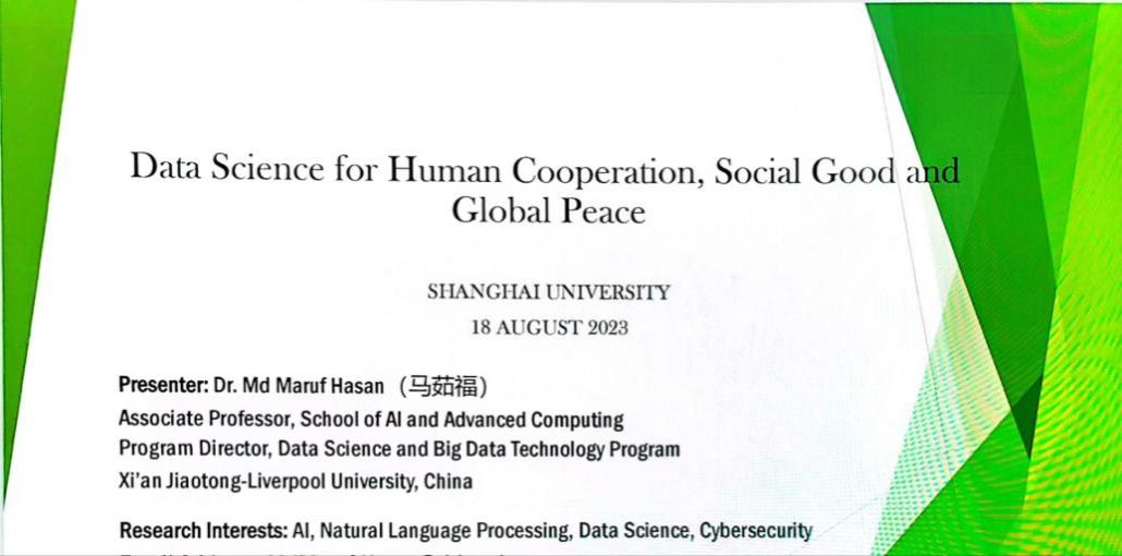 会议下半段,Maruf Hasanz主任做了题为“Data Science for Human Cooperation,Social Good and Global Peace”的发言,介绍了其正在执行的项目内容、目标和挑战等,重点强调了数据科学服务人类发展的理念以及科研合作的必要性。对此,唐青叶副院长表示高度赞同,并就项目之间的契合点和共通点做了进一步说明。