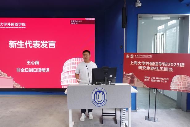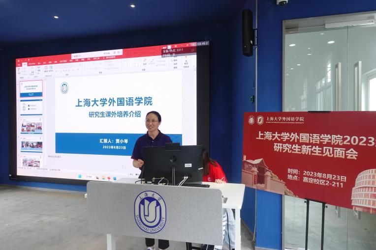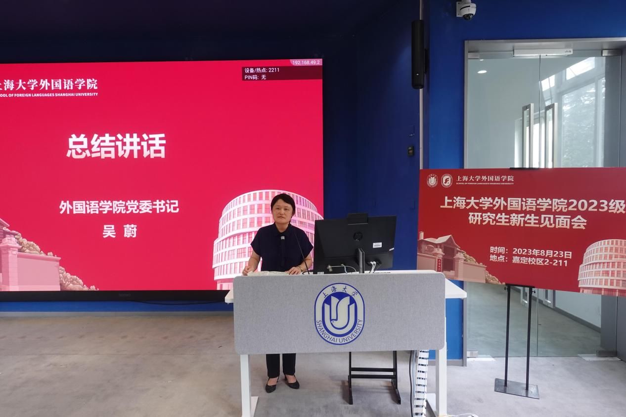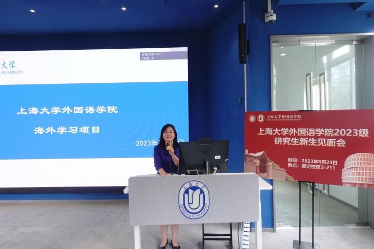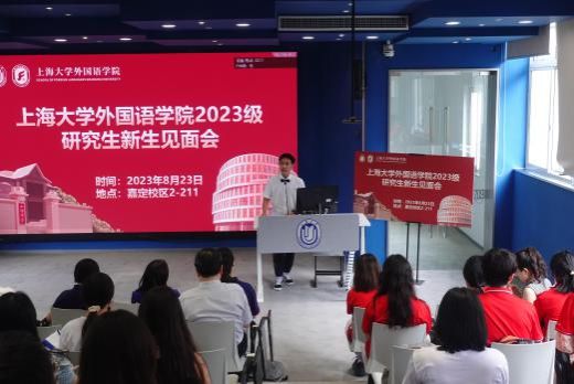 上海大学外国语学院2023级研究生新生见面会于8月23日14:00在嘉定校区二教211教室顺利举行。外国语学院党委书记吴蔚,党委副书记、院长尚新,党委副书记、副院长贾小琴,副院长戴朝晖,副院长唐青叶,副院长阚怀未,英语系主任张建琴,日语系主任赵莹波,法语系主任王文新,法语系副主任向维维,MTI中心副主任花亮,研究生辅导员曹若兰,研究生教学秘书张静,研究生教学秘书姚远及2023级全体研究生出席了本次活动。本次新生见面会由研究生会文体部部长程路主持。