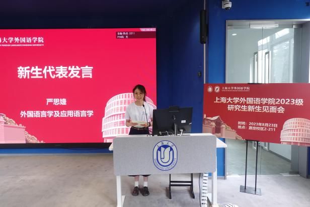 2023级全日制外国语言学及应用语言学专业严思婕同学和非全日制日语笔译专业王心雨同学作为新生代表发言。首先,严思婕同学以自己在疫情期间参加复试时发生的故事开头,回顾了自己的求学之路,向大家分享了自己从中收获的感悟以及对未来的展望。接着,王心雨同学以“平行线”和“相交线”这两个数学名词出发,浅谈自己有幸在上海大学就读的感想,表达了能与在场同学相遇的感恩心情,并对自己提出了三条“减一减”的要求。