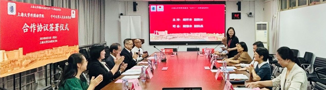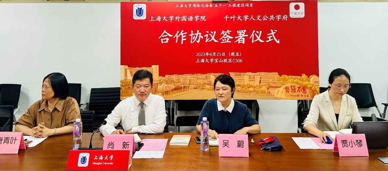 2023年8月25日上午,上海大学外国语学院与日本千叶大学人文公共学府正式签署了合作协议。这是上海大学与千叶大学校级合作框架下首个院级合作项目,也是上海大学国际化培养“五个一”工程建设的重要活动之一。仪式在上海大学宝山校区C506举行。外国语学院党委书记吴蔚,党委副书记、院长尚新,党委副书记、副院长贾小琴,副院长戴朝晖、唐青叶、阚怀未,日语系主任赵莹波、教授苏鹰以及日语系教师代表出席了协议签署仪式。