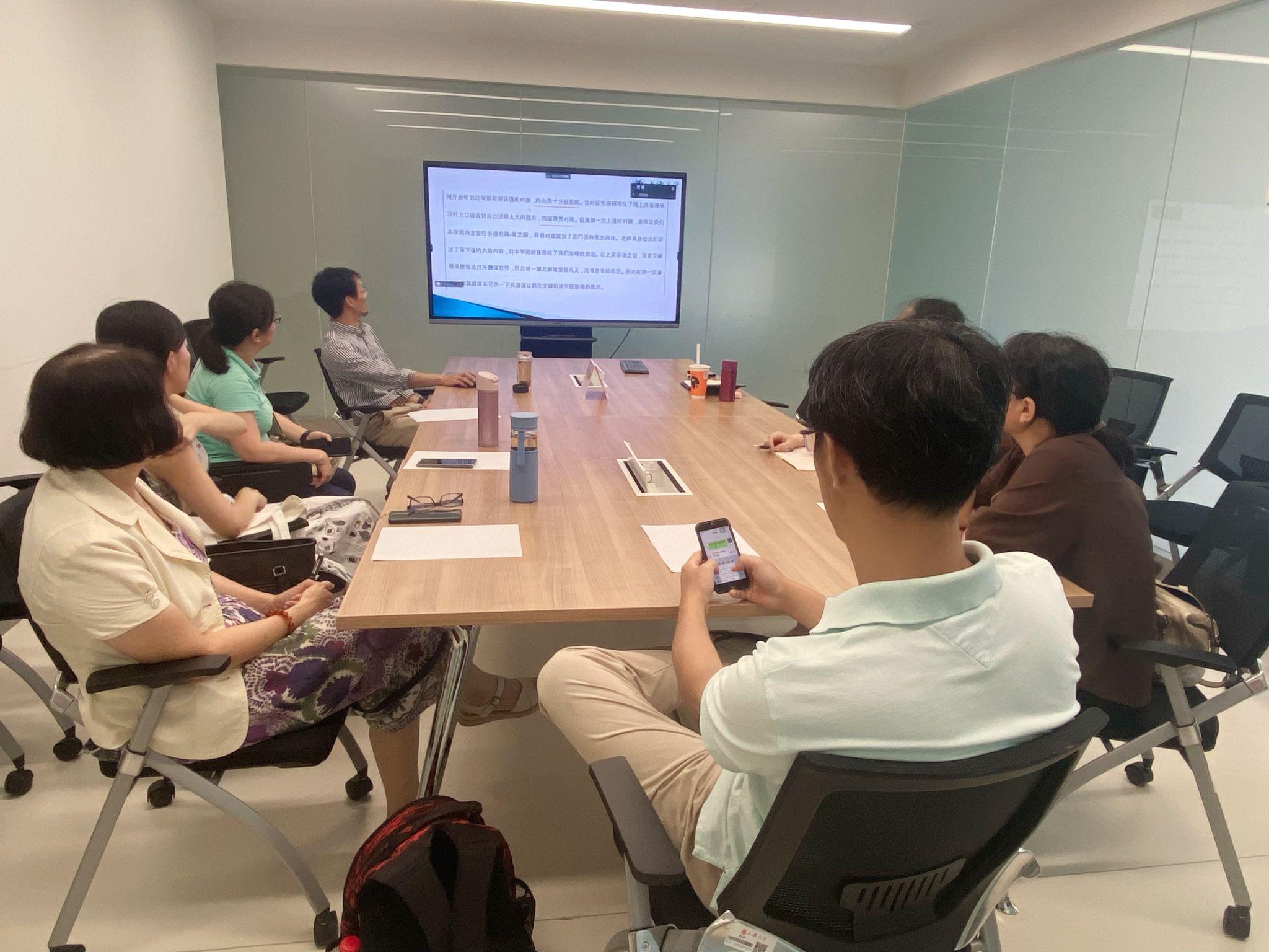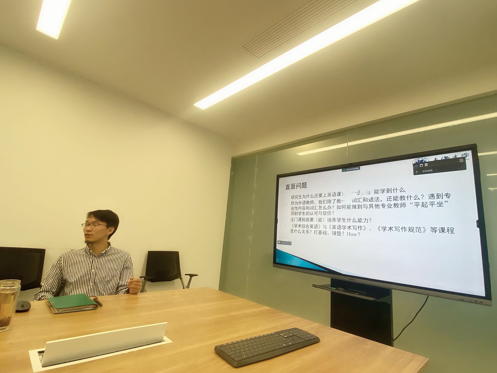 为更好地提升研究生综合英语教学技能,优化教书育人的质量。9月1日下午,外国语学院研究生公共外语部在宝山校区C414b召开教学经验交流座谈会,座谈会由研究生公共外语部主任马拯主持,研公外部竹旭锋老师结合自己丰富的授课经验做了精彩的学术综合英语A级教学经验分享,研究生公共外语部全体教师参加了本次会议。