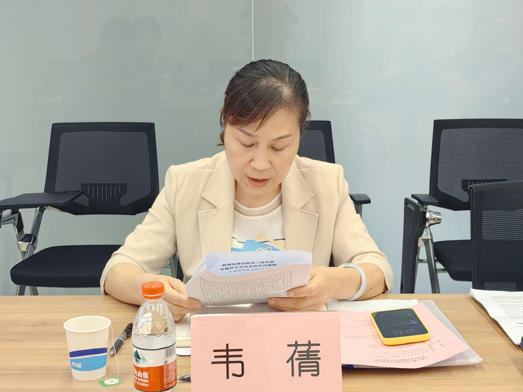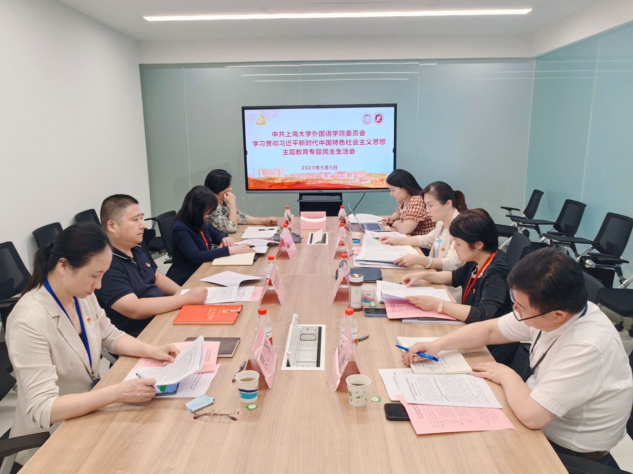 9月5日下午,外国语学院党委学习贯彻习近平新时代中国特色社会主义思想主题教育专题民主生活会在宝山校区C414b举行。主题教育办公室联络组第三联络小组组长韦蒨、联络员张玉昭到会指导,学院领导班子参加会议,会议由学院党委书记吴蔚主持。