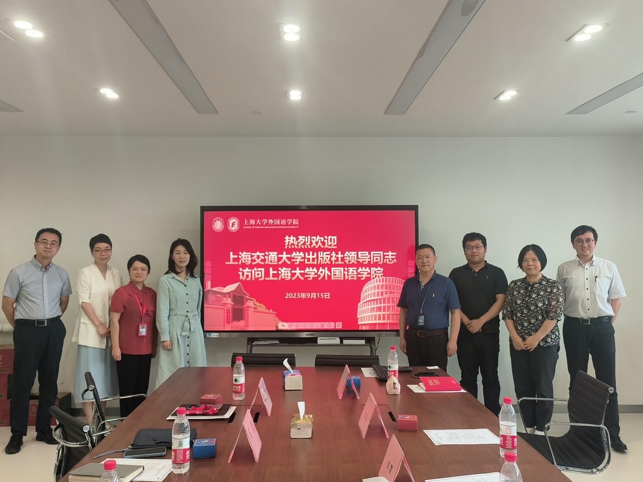为进一步加强产学研融合、深耕学生实习实践基地建设,2023年9月15日下午13时,上海交通大学出版社人文分社社长崔霞、副社长赵斌玮,上海交通大学出版社国际合作部主任李旦一行三人应邀访问上海大学外国语学院。上海大学外国语学院党委书记吴蔚、党委副书记、院长尚新、副院长唐青叶、MTI中心执行主任朱巧莲、东亚研究中心执行主任孙若圣等领导老师参与交流研讨。交流会由孙若圣副教授主持。