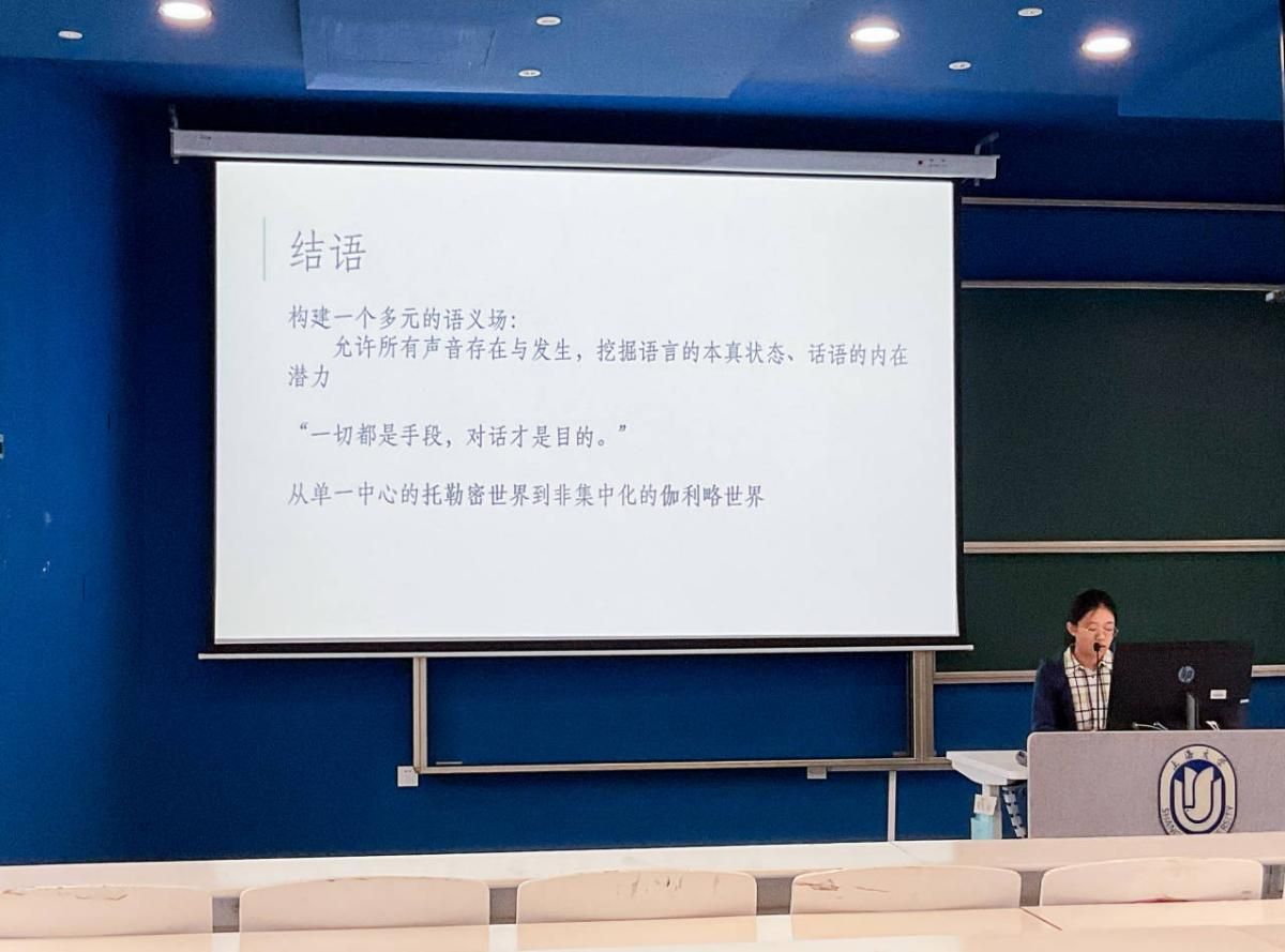第三位主讲人是2021级本科生顾冰洁同学,她汇报的主题为“巴赫金理论视域下《唐人街内部》‘杂语’现象研究”。她从作者的华裔身份和叙事语言入手,结合巴赫金的“众声喧哗”概念深入浅出地讲解了华裔族群在美国社会中的话语权状况,点明作者对族群间平等对话的呼吁。董洵同学就“平等世界”同顾冰洁同学进行了充分讨论,唐青叶教授对现阶段的研究成果作出了肯定评价,并希望顾冰洁同学能够结合更多的具体案例来论证研究主题。张颖副教授对顾冰洁同学的学术潜力表示欣赏,并提出对话是聚焦小说内部还是读者作者之间的问题引导顾冰洁同学进行深入思考。