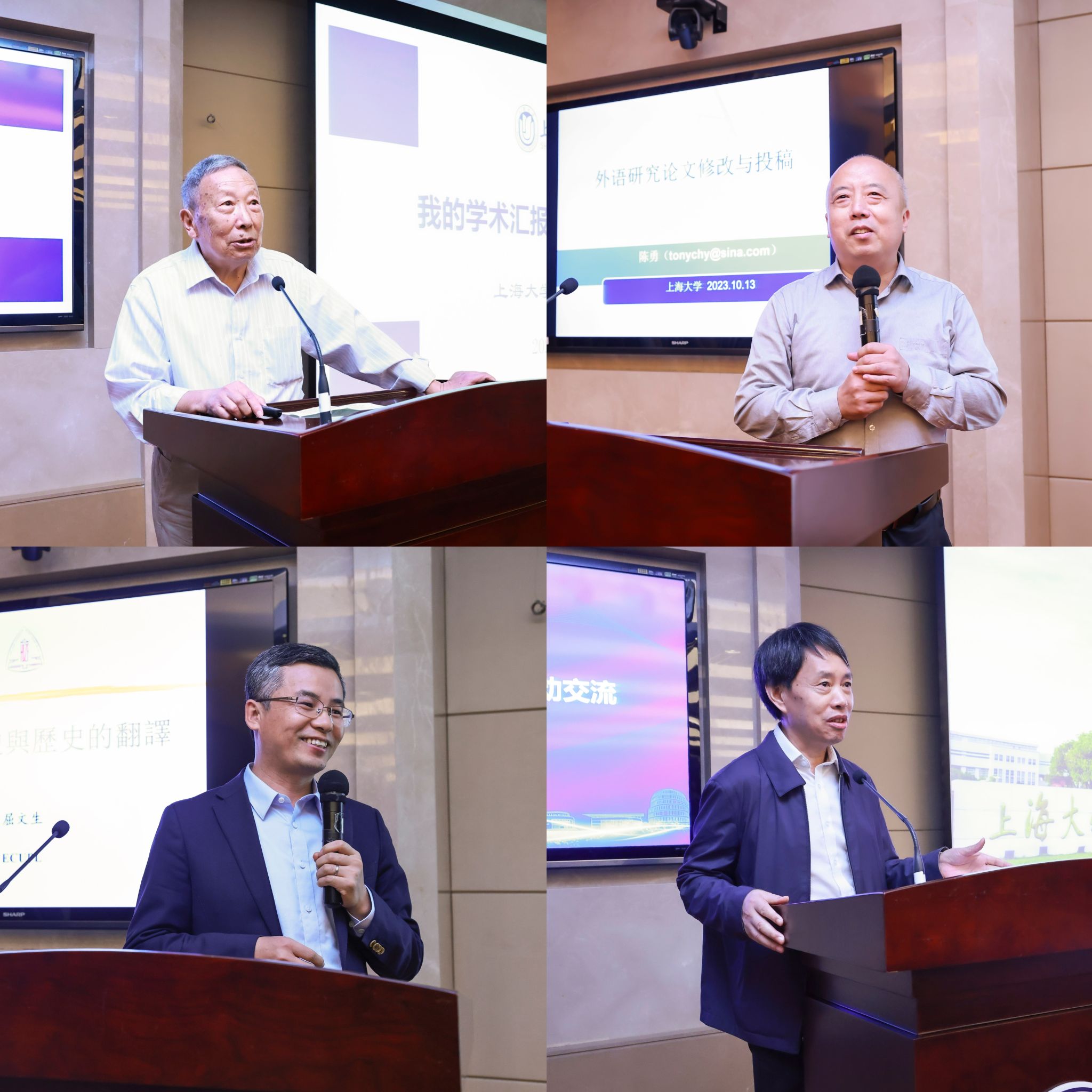 第一位主讲嘉宾“翻译文化终身成就奖”获得者、上海大学外语学院荣休教授方梦之先生发表了题为《我的学术汇报(2015-2023)》的主旨演讲。方教授回顾了自己从2015年起至今的学术经历与主要学术成果,总结出了在“学术过程中享受人生”的超然感悟。方教授在学术道路上锲而不舍、矢志不渝的精神令在场师生为之动容。