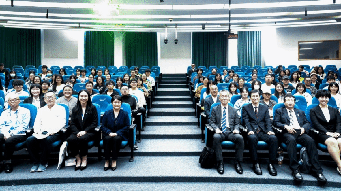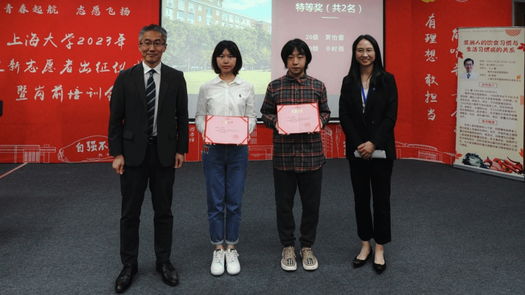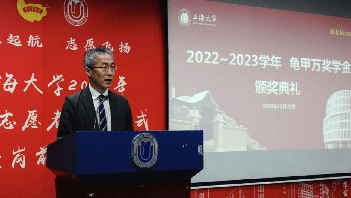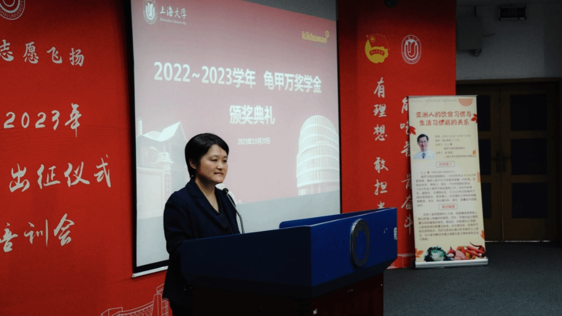 10月20日下午,拥有350多年历史的世界知名日本调味品品牌龟甲万公司海外管理部部长梅本洋先生一行访问我院。龟甲万公司旗下的龟甲万综合医院院长三上繁在宝山校区J102为日语系师生做了题为“亚洲人的饮食习惯与生活习惯病的关系”的专题演讲。演讲后,举行了2022-2023学年KIKKOMAN“紫 MURASAKI”奖学金颁奖仪式。上海市对外友协郭盛麟处长,龟甲万海外管理部部长梅本洋先生,海外管理部项目负责人大泽 绫女士,外国语学院党委书记吴蔚,党委副书记、副院长贾小琴,日语系主任赵莹波和近百名日语系师生参加了讲座和颁奖仪式,本次活动由日语系廖瑞平老师中、日双语主持。