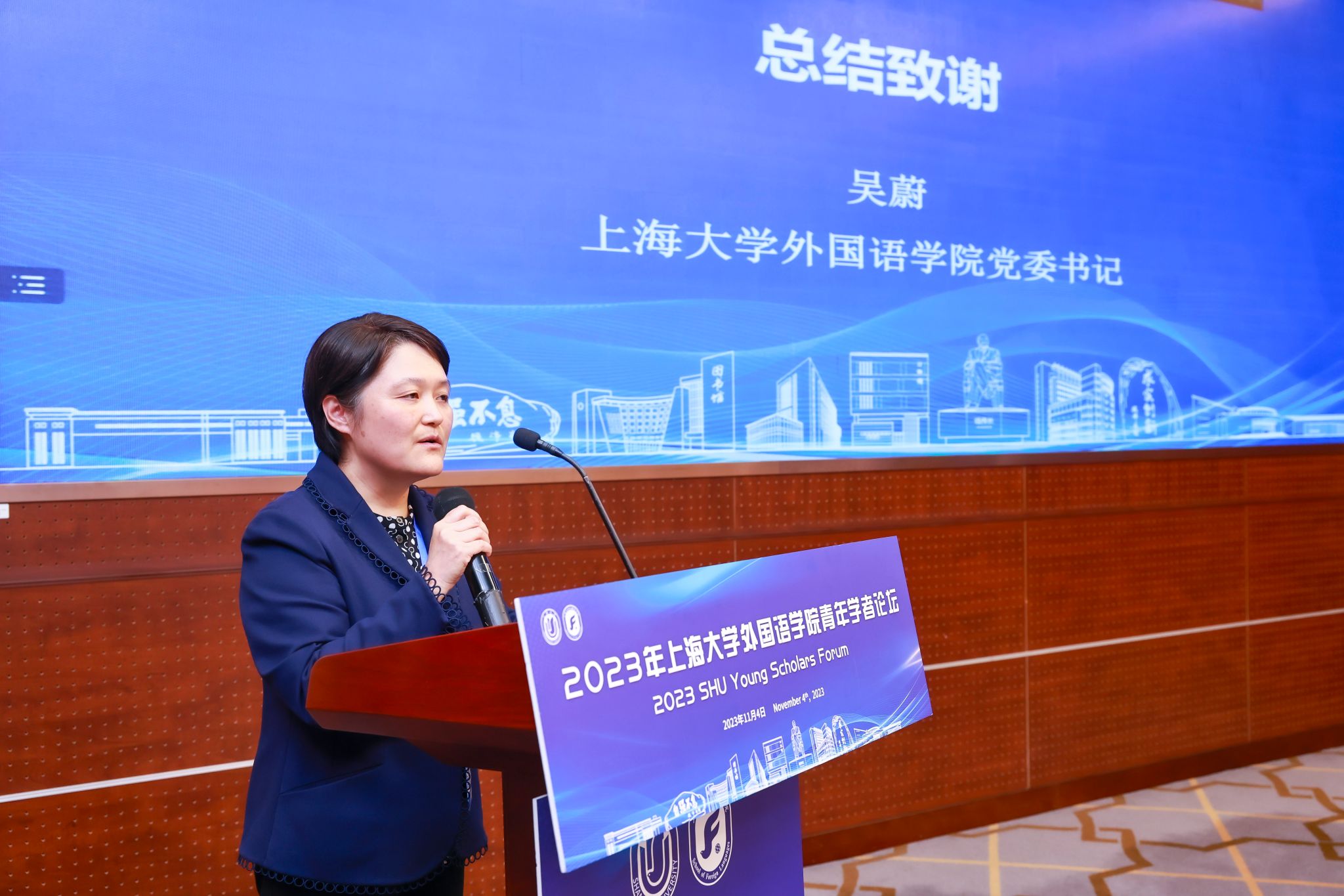 闭幕式上,尚新院长为陈雷研究员颁发了“上海大学外国语学院客座教授”聘书,吴蔚书记为与会青年学者颁发了参会证明,随后为本次论坛做致谢总结。吴书记首先代表学院向参加本次高水平青年论坛学术盛会的全体专家和青年才俊表示感谢,强调青年学者是学科发展和科学研究的青春之源,是学院未来发展中最积极、最蓬勃、最有朝气的青春力量。学院此次围绕“融通中外、文明互鉴”主题举办青年学者论坛,开阔了各学科领域之间、各语种之间的研究视野,推动了青年师生之间的思想碰撞与合作交流,鼓励青年学者通过思想的汇聚融通来提升学术研究的广度和深度,同时在以提升国际传播效能、助推中外文明交流互鉴的学术使命方面达成了高度的共识。