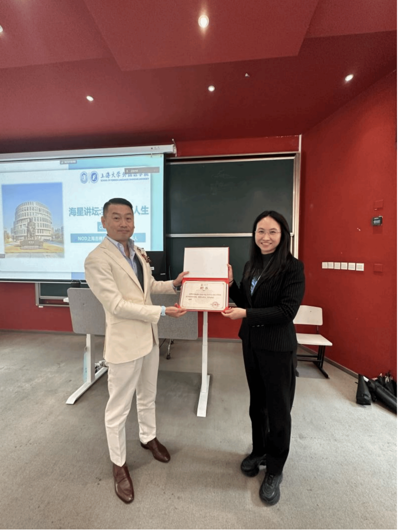 接着,贾小琴老师为郑志晖先生颁发上海大学外国语学院校外导师的聘任证书。