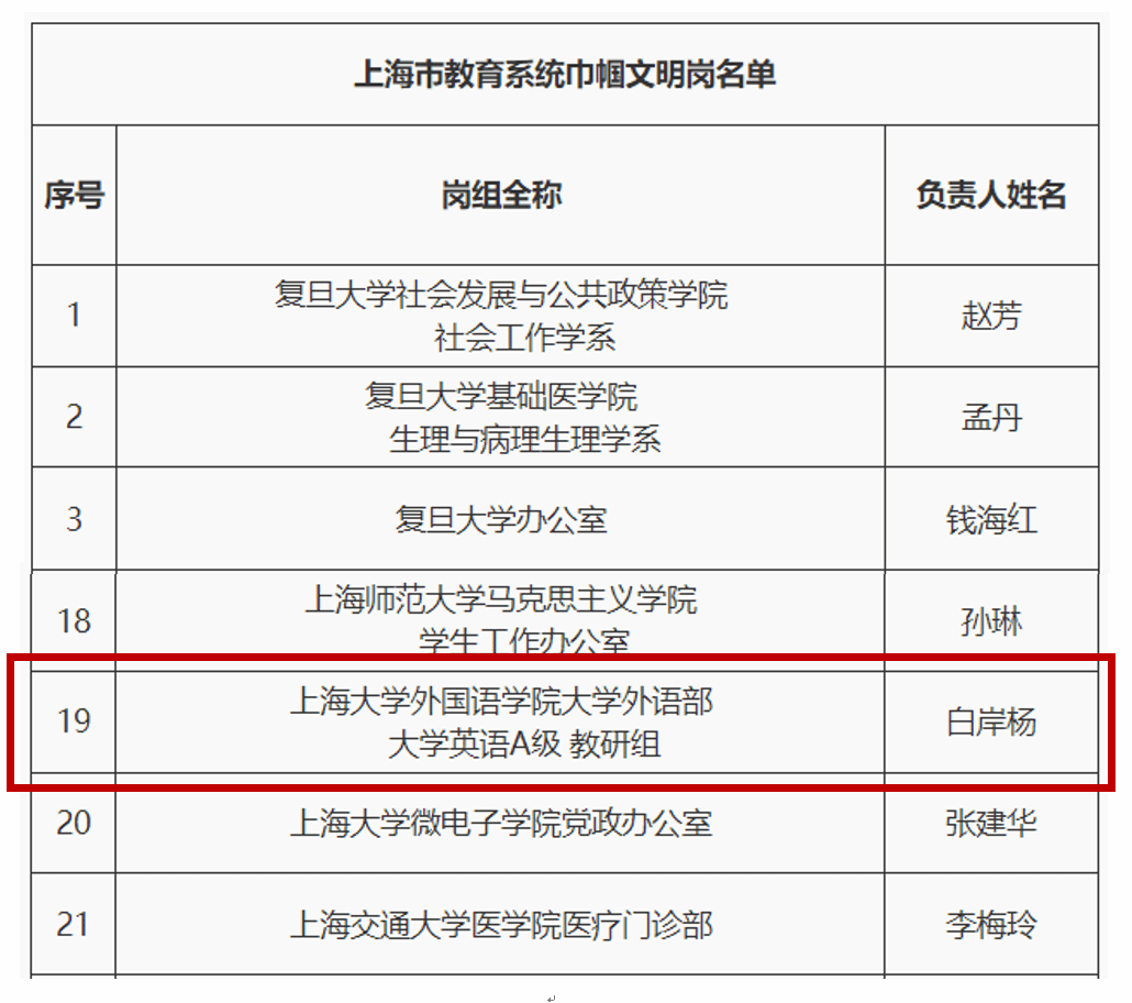 根据上海市教育工会、上海市教育系统妇女工作委员会《关于开展2023年上海市及教育系统巾帼文明岗(巾帼建功标兵)选树活动的通知》(沪教妇[2023]8号),经各单位民主推荐、教育系统妇工委组织评审,上海大学外国语学院大学外语部“大学英语A级”教研组荣获“上海市教育系统巾帼文明岗”称号。