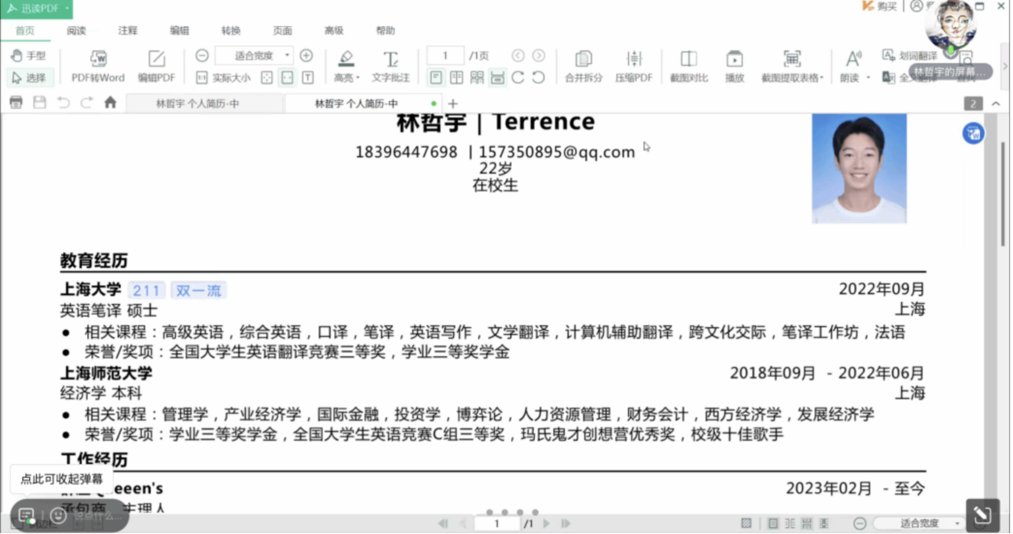 第二位主讲人是来自英语笔译专业的林哲宇同学,目前就职于宁德时代新能源科技股份有限公司海外服务部。林哲宇同学结合自身半年左右的实习就职经历,为大家具体讲解了简历制作和面试表现的相关内容。他特别提醒大家在简历制作时要注重展现自己的特长和优势,展示个人的魄力、执行力等,从而能够主动把握机会,自主争取,全面展示自己。