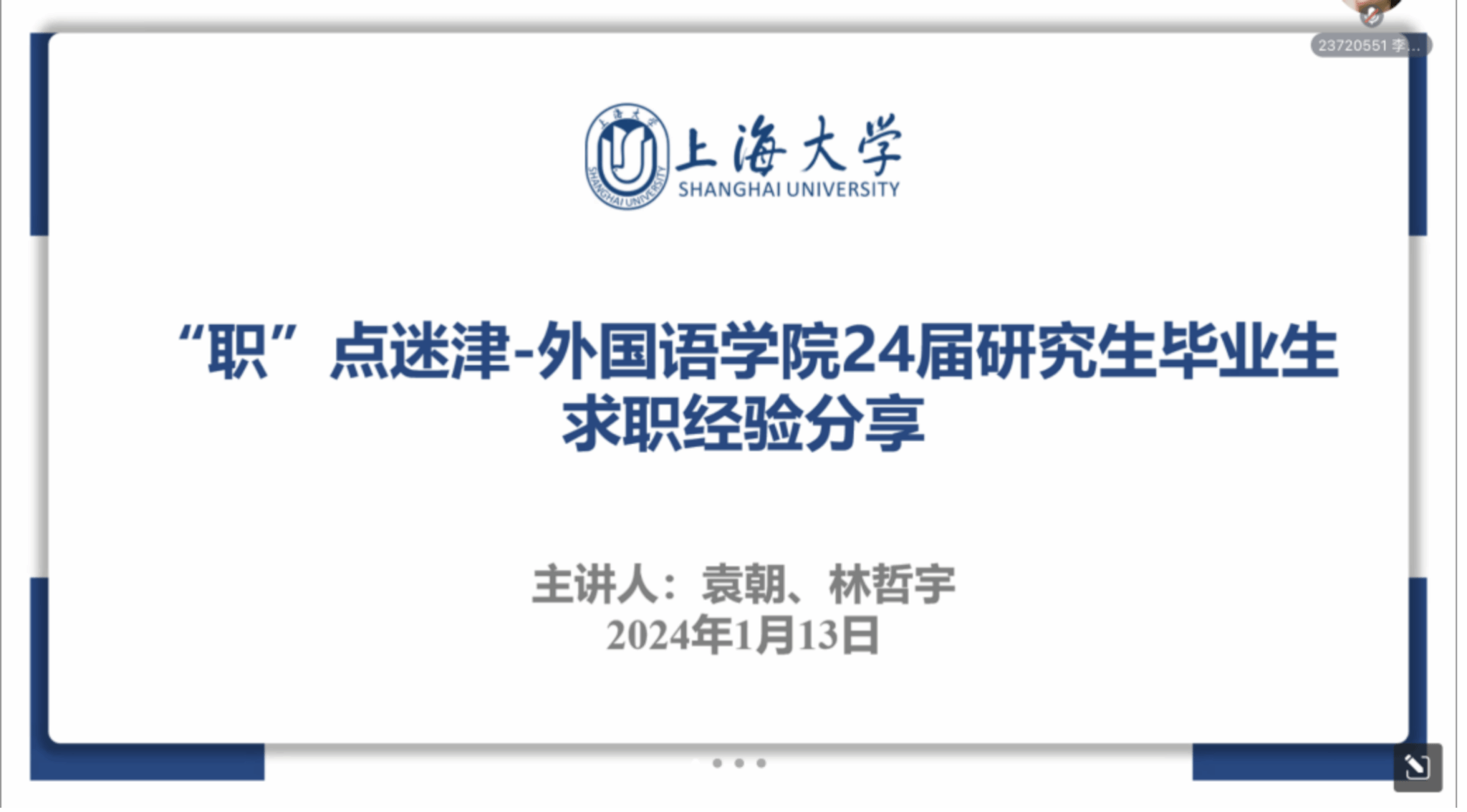 为帮助外语学子了解就业相关信息,积累求职的经验,进一步做好就业准备,外国语学院于1月13日线上举办2024届研究生毕业生求职经验分享会。活动邀请了2024届研究生袁朝、林哲宇作为本次活动主讲人。两位同学结合自身经验,从简历制作、面试经历等方面分享,帮助同学们了解就业方向,学习面试时的技巧,树立信心。本次经验分享会由2022级英语语言文学张秋月主持会议,外国语学院研究生积极参加本次分享会。