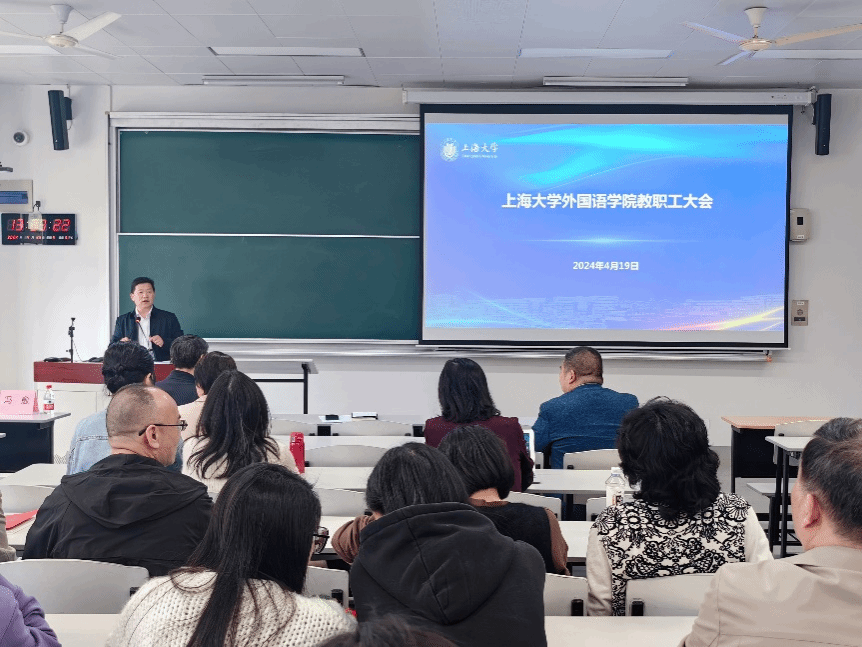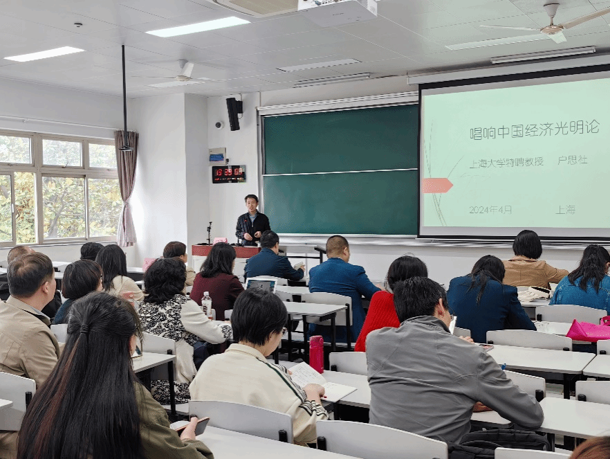 4月19日下午,外国语学院全体教职工大会在BJ203顺利召开。大会由外国语学院党委副书记、院长尚新主持,学院党政领导班子、教职工出席了本次会议。上海大学特聘教授户思社围绕学习贯彻全国两会精神,做了题为“唱响中国经济光明论”的专题讲座。