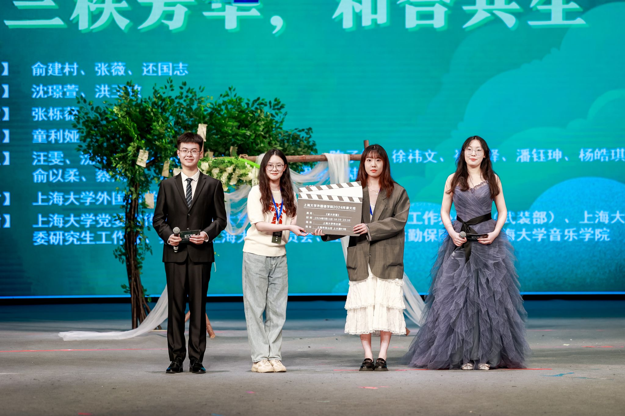 上海大学学生工作办公室主任、武装部部长、本科生书院管理中心主任孟祥栋,妇委会常务副主任吴国琴,音乐学院党委书记卿扬,党委宣传部融媒体中心副主任谢瑾,教务部教学改革处处长余长君,教务部现代教育技术中心主任陈章进,国际部党委副书记陈秀猛,对外联络处副处长、校友会副主任彭明霞,上海大学钱伟长学院党委副书记、副院长沈青松,教育部高等学校外语专业教学指导委员会委员、法语分委员会副主任委员、上海大学特聘教授户思社,教育部法语教指委副主任委员、北京大学教授、博士生导师杨国政,教育部法语教指委委员、北京外国语大学教授、博士生导师车琳教授,南京大学教授、博士生导师黄荭教授、宝山区大场镇党委副书记张杲校友,西交利物浦大学校企合作主任、人工智能与先进计算学院高级副教授徐鹏景,西交利物浦大学对外教育中心主任王健嘉,顾村中学党支部书记张建国,上海大学附属小学校长朱燕,上海大学附属学校校长办公室主任牛海云,科大讯飞股份有限公司经理赵望淙,上海左旗电子科技有限公司衣永政,上海吉棒贸易股份有限公司田建云,本年度大戏指导教师上海戏剧学院俞建村教授、上海大学文学院张薇副教授、上海大学音乐学院还国志老师以及外国语学院党委书记吴蔚,党委副书记、院长尚新,党委副书记、副院长贾小琴,副院长戴朝晖、唐青叶与学院系部主任和师生代表、校友、共建单位、上海大学基础教育集团单位上海大学附属中小学、甘泉外国语中学的领导、老师和同学们一同观看了大戏演出。此次毕业大戏演出吸引了众多校内外师生和校友们的关注,演出当晚,伟长楼现场六百余名观众冒雨前来,共同见证上海大学的“三秩芳华”、外国语学院的“和合共生”。