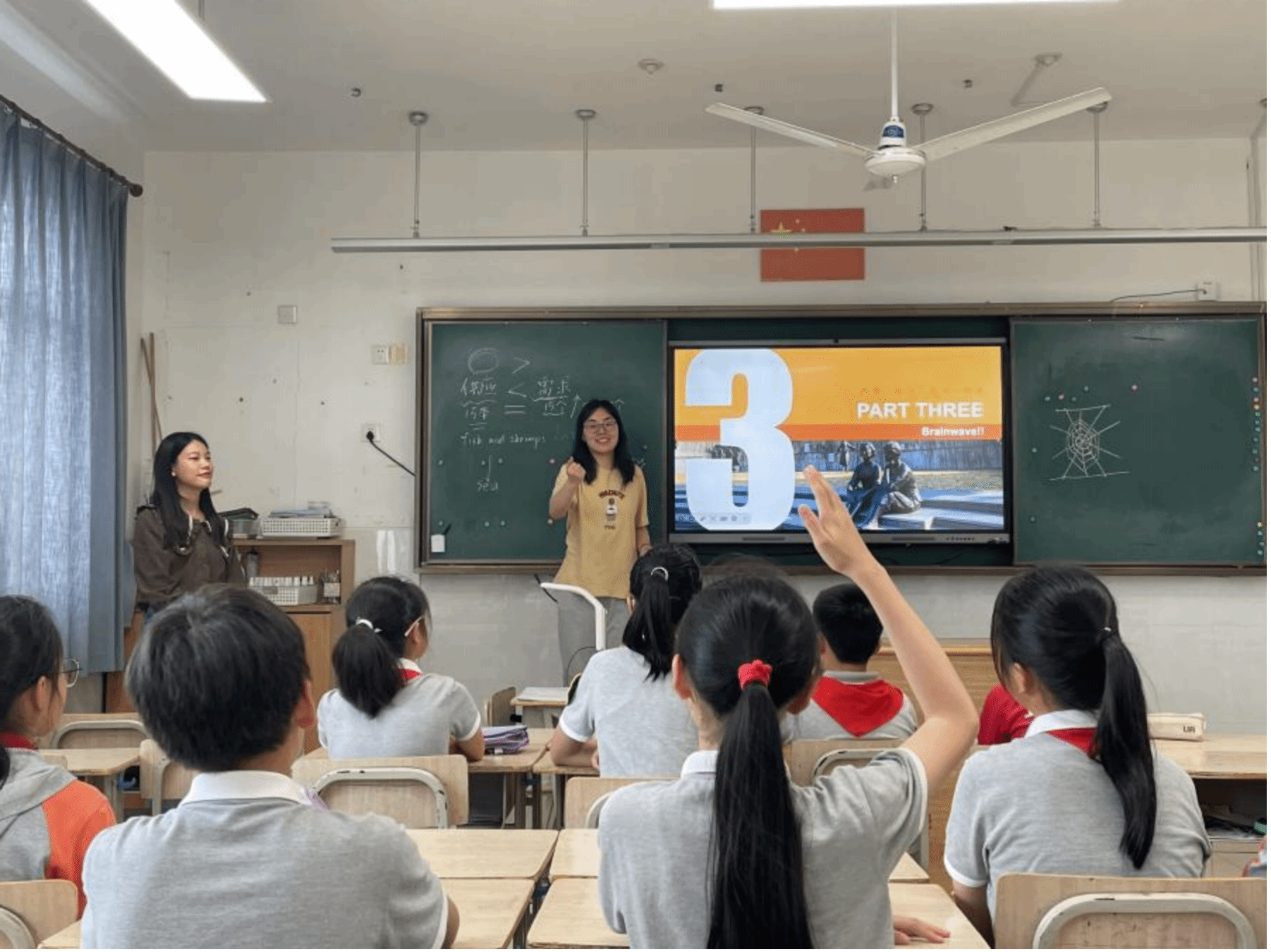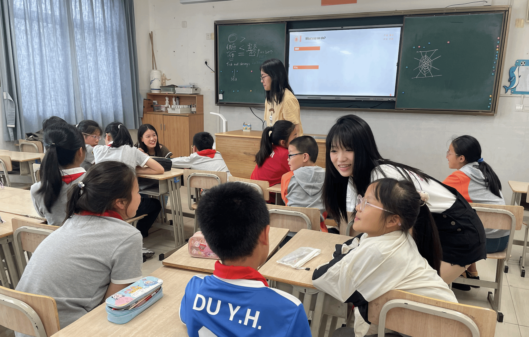 活动中,三位大学生帮助小朋友将座位布置成四组。由陈旖旎同学针对“阅·无界”项目进行简单介绍;孙欣悦同学展开故事分享,选取的是中国神话故事“伏羲织网”,让孩子在了解中国故事的同时能够积累英文表达、提升英文表达能力;强丽雯同学聚焦人与自然和谐共处的主题组织小朋友分组进行讨论。三位小老师分别加入不同小组的讨论,引导学生尝试表达自己的看法。课程深受孩子们喜欢,现场氛围活跃热烈,孩子们纷纷表示自己从课程中收获了很多。