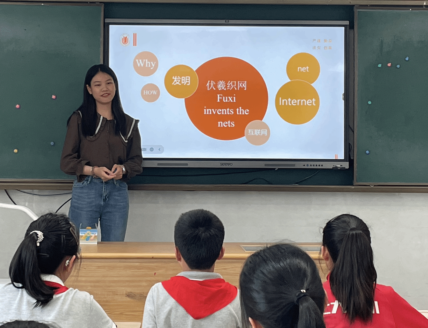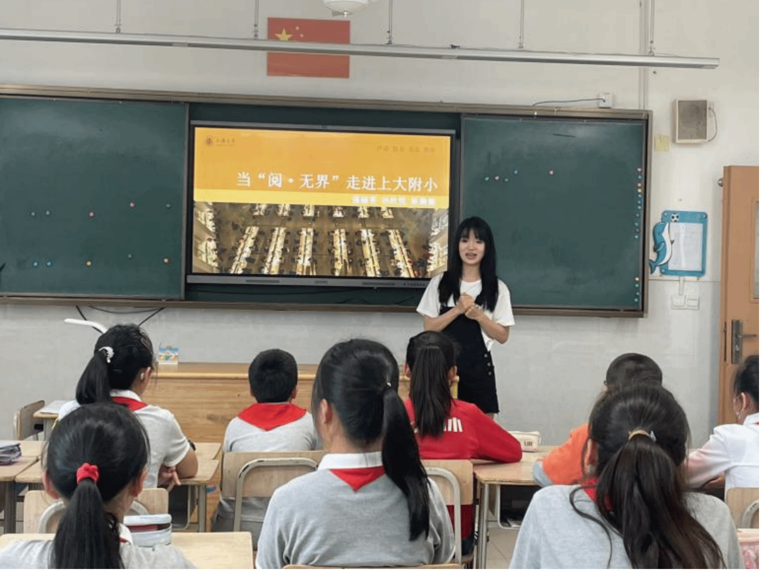 2024年5月27日,在上海大学外国语学院副院长唐青叶、英语系主任张建琴和大学外语部主任李晓媛老师的带领下,上海大学本科生强丽雯、孙欣悦、陈旖旎为上海大学附属小学的同学们带来了一堂绘本课。本次活动是《英语语言学概论》课程的课外实践活动Buddy Reading伴读活动的延伸活动,目的是探索“智慧赋能中国话语的国际表达能力培养”模式,提升孩子们用地道英语讲述耳熟能详的中国故事的能力。本次活动前期,上海大学《英语语言学概论》教学团队和上海大学附属小学团队进行了讨论和备课,在上海大学附属小学朱燕校长、周骏青副校长、沈云霞主任和顾美华主任的共同努力下,制定了三期的活动方案,本次活动是后续活动的预热。