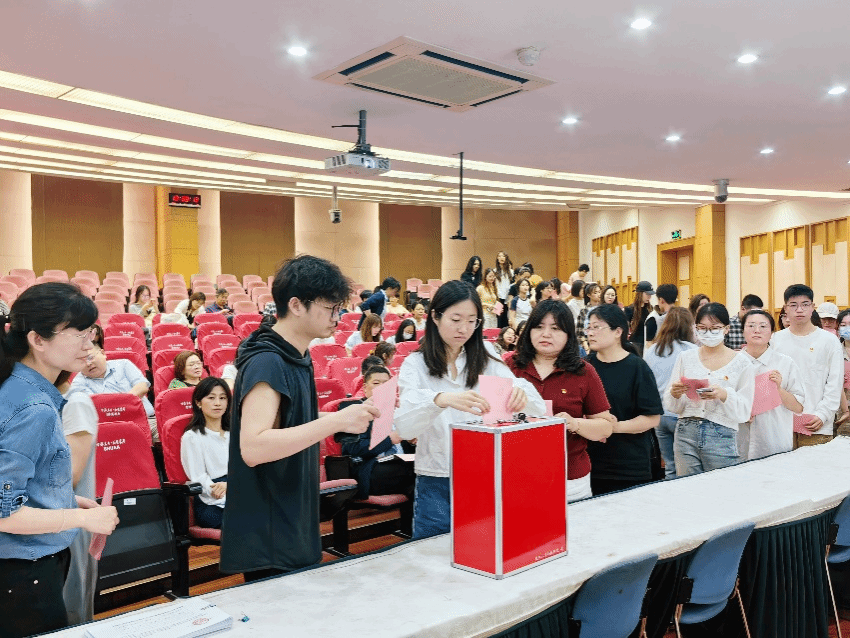 随后,选举环节由总监票人贾小琴同志主持。经无记名差额投票选举、公开计票,选举产生了外国语学院党委出席中共上海大学第四次代表大会的代表。最后,大会在国际歌中胜利闭幕。