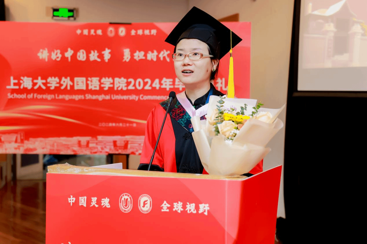 导师们的谆谆教诲点燃了学生们探求新知的火苗。在这个特别的时刻,导师代表日语系文雪老师向毕业生们寄语。在外国语学院度过的四年时光,无论欢笑还是泪水,都是人生中的宝贵体验。人生最重要的课题之一就是自我成长,在这门课上,永远不会毕业。愿上大外院教给大家的一切,在今后的人生中,能够助力大家不断成长,愿大家归来仍是闪闪发光的小海星。