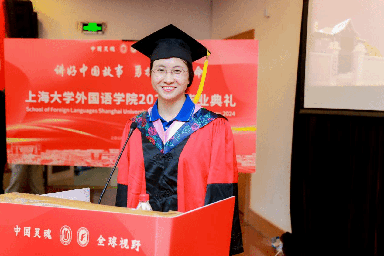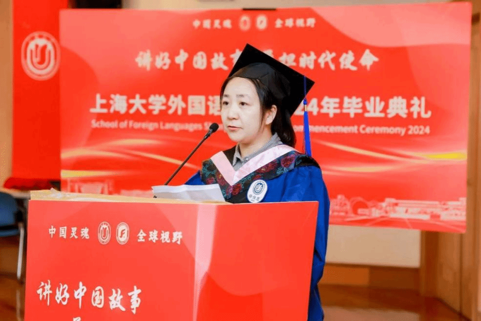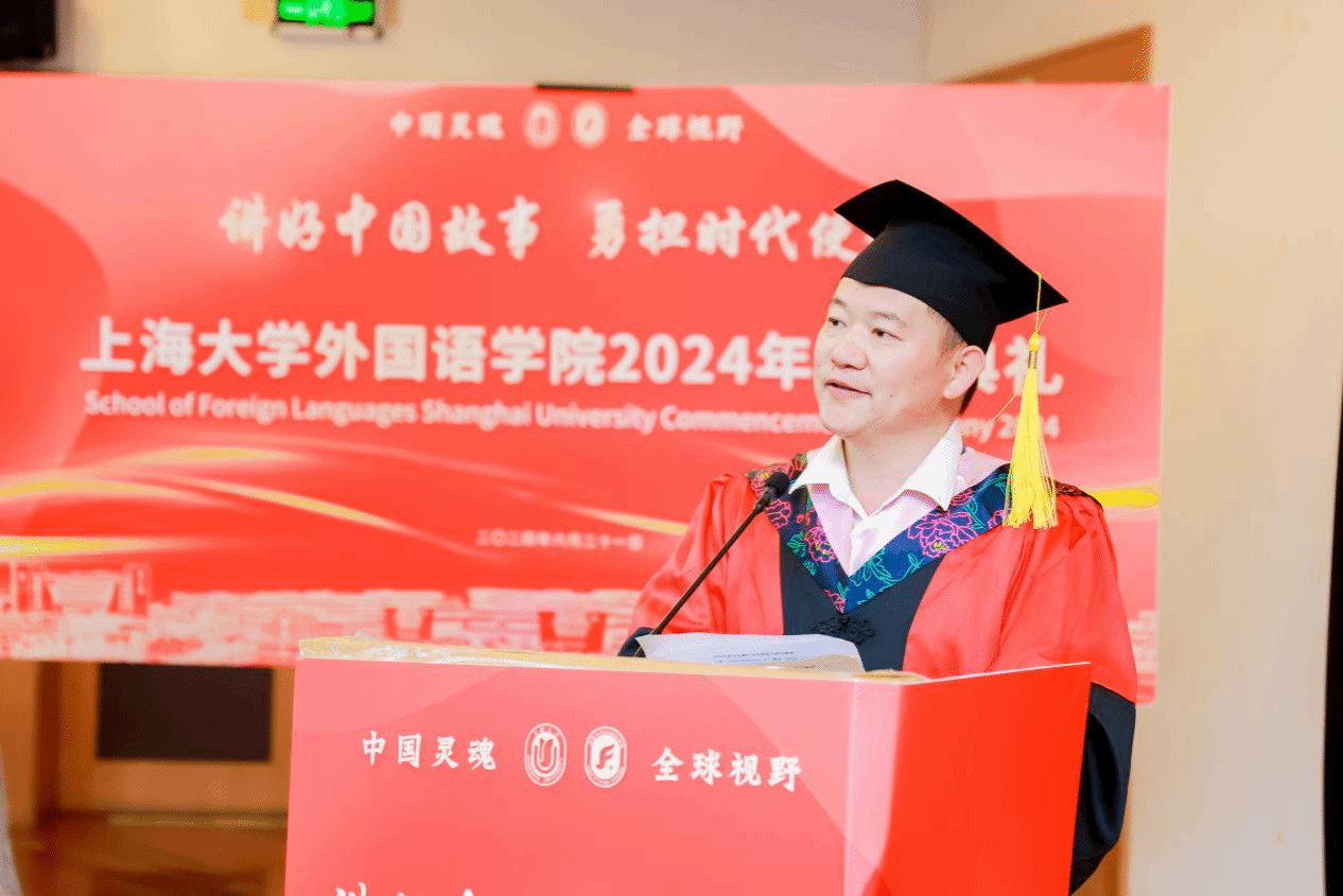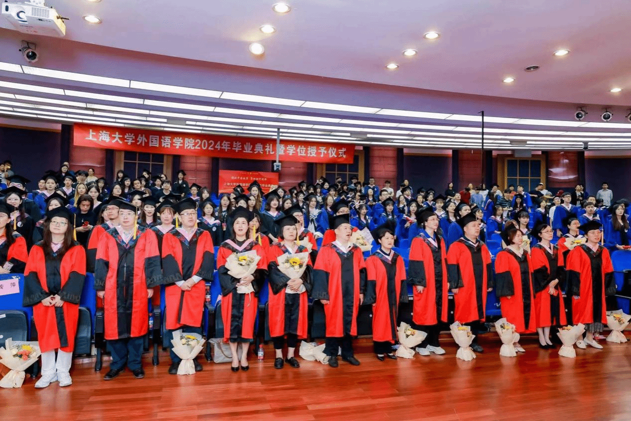 6月21日下午,上海大学外国语学院2024年毕业典礼暨学位授予仪式在宝山校区J202隆重举行。外国语学院党委书记吴蔚,党委副书记、院长尚新,党委副书记、副院长贾小琴,副院长戴朝晖、唐青叶,学院工会主席黄欣,英语系主任张建琴,副主任龚萍,日语系主任赵莹波,副主任苏鹰、文雪,法语系主任王文新,大学外语部主任李晓媛、副主任于梅欣,研究生公共外语部主任马拯,MTI教育中心副主任花亮,教师代表邓志勇、竹旭峰、李夏青、张晓娜、张永娇、焦舒曼等,校友代表朱依蓓以及2023届毕业生和2024届毕业生代表共同参加了本次毕业典礼。典礼由2022级法语专业本科生宁文燕和2023级日语专业本科生邓修杰主持。