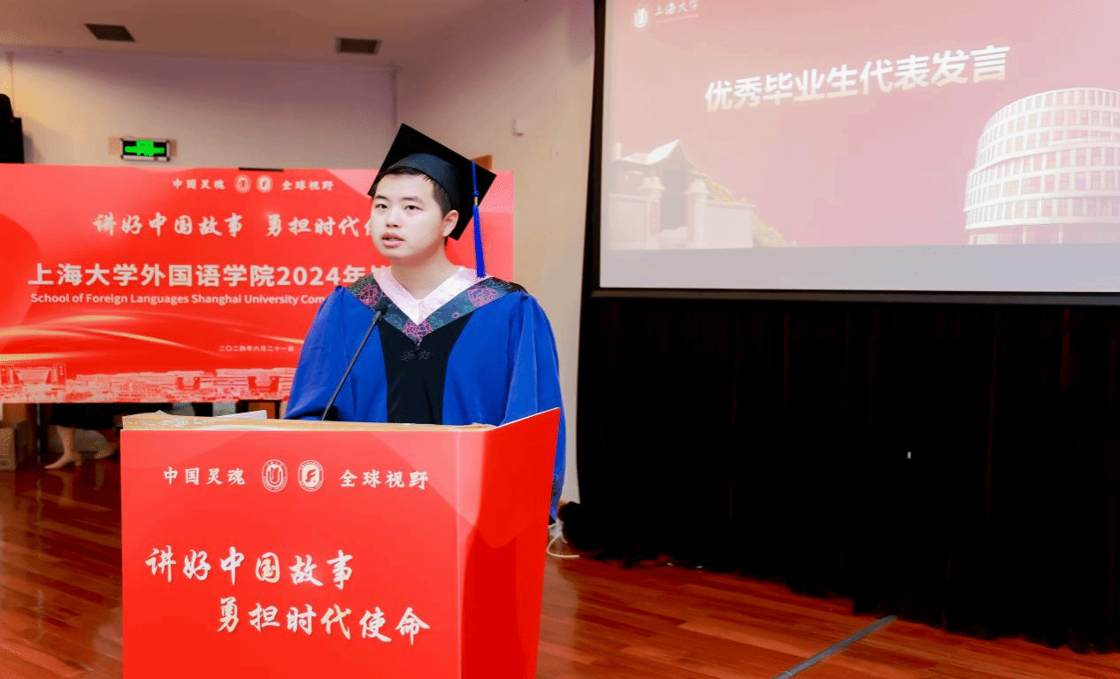 上海市优秀毕业生沈璟萱同学提及大学四年丰富多彩的校园生活,尤其是作为2024年度大戏导演的过程中感受到中外文明互鉴的魅力,表示身为外院学子们今后会继续努力做好中国故事的讲述者。