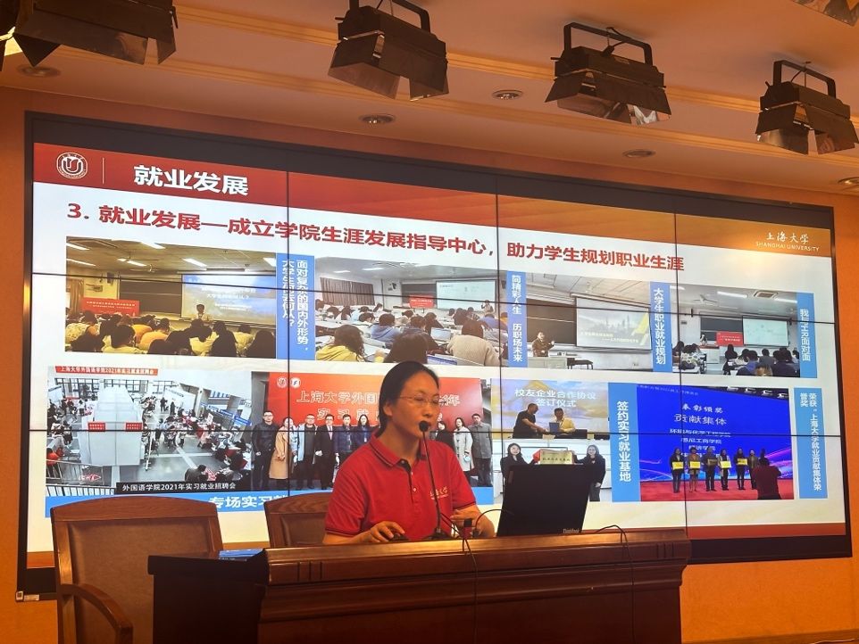 宣传会伊始,贾小琴老师对上海大学外国语学院进行了整体介绍。贾老师先从宏观角度向在座的同学和家长们介绍了外国语学院的构成情况,然后从特色课程、全程导师制度、学院特色毕业大戏、学院学术概况等多个角度展示了外国语学院的风貌,展现了学院多元化的教学特色和开放包容的教学理念。