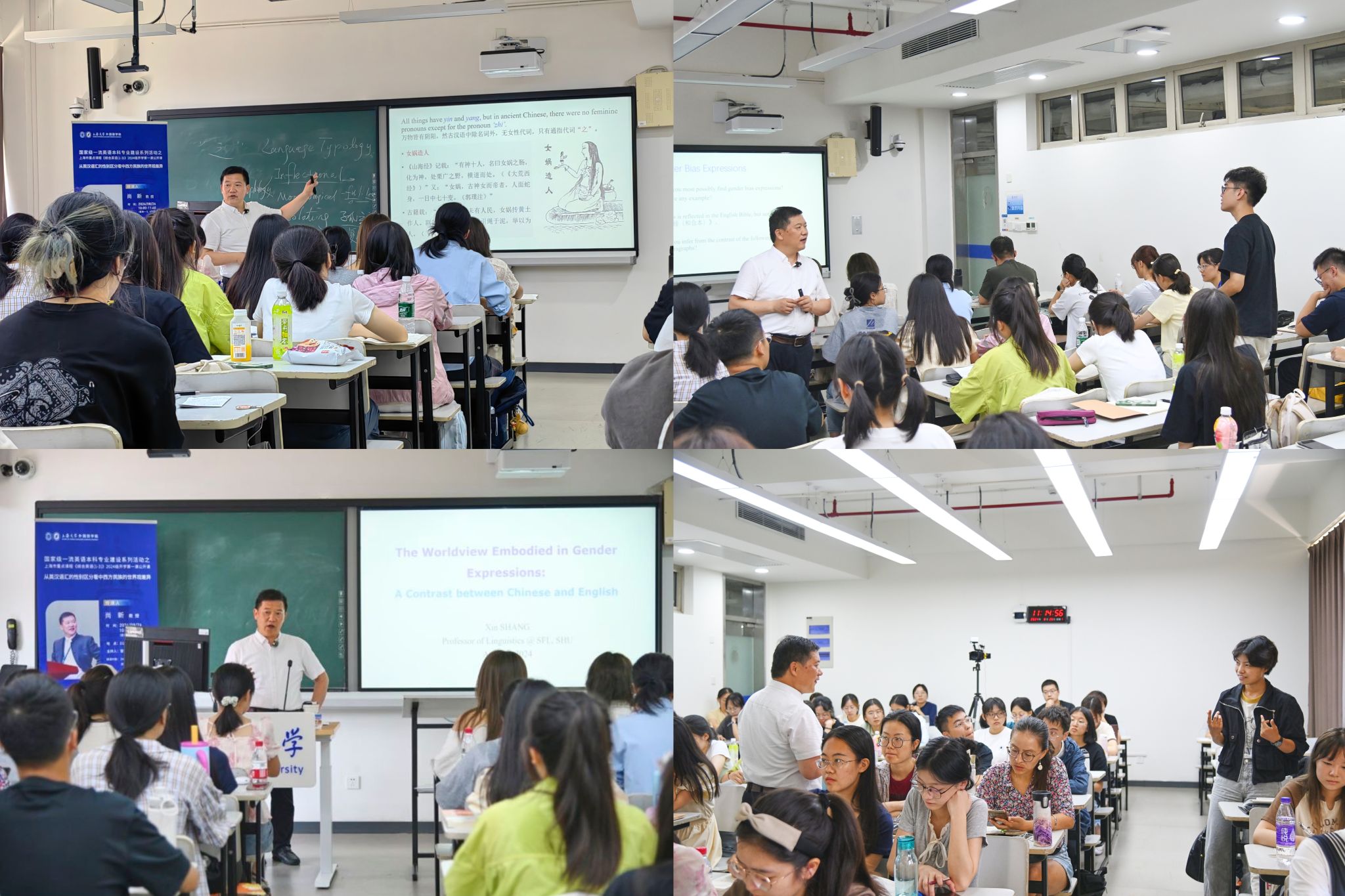 8月26日,我院英语系上海市重点课程《综合英语(1-3)》2024级开学第一课公开课在D221顺利举行。公开课以《从英汉语汇的性别区分看中西方民族的世界观差异》为题,由院长尚新教授主讲,由雷远旻老师主持,授课对象为全体2024级英语专业的新生,学院党委书记吴蔚、部分老师旁听了此次课程。