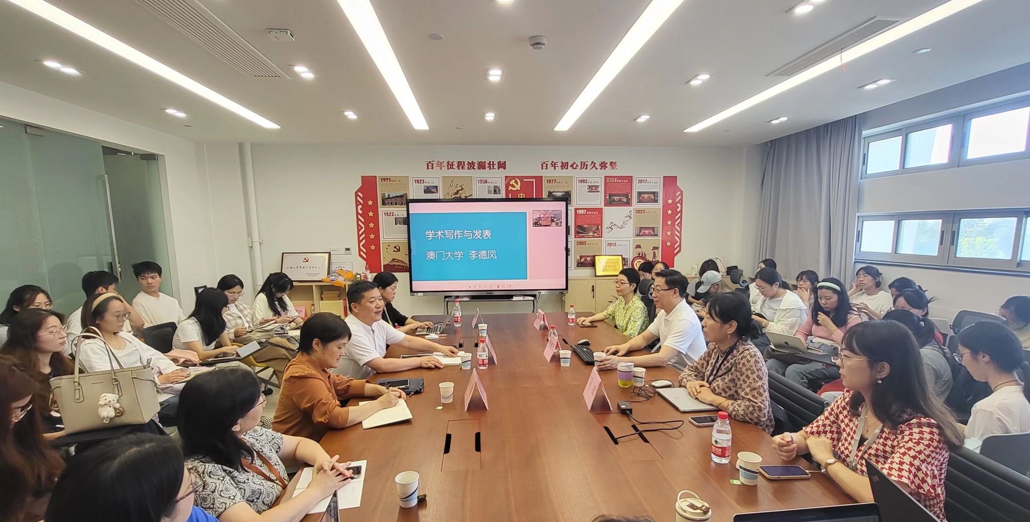 9月27日下午,澳门大学人文学院副院长李德凤教授在宝山校区C412为我院师生开设讲座,讲座主题为“学术论文写作与发表”。上海大学外国语学院院长尚新教授主持了本次讲座,外国语学院党委书记吴蔚老师及线上线下共百余名师生聆听了此次讲座。
