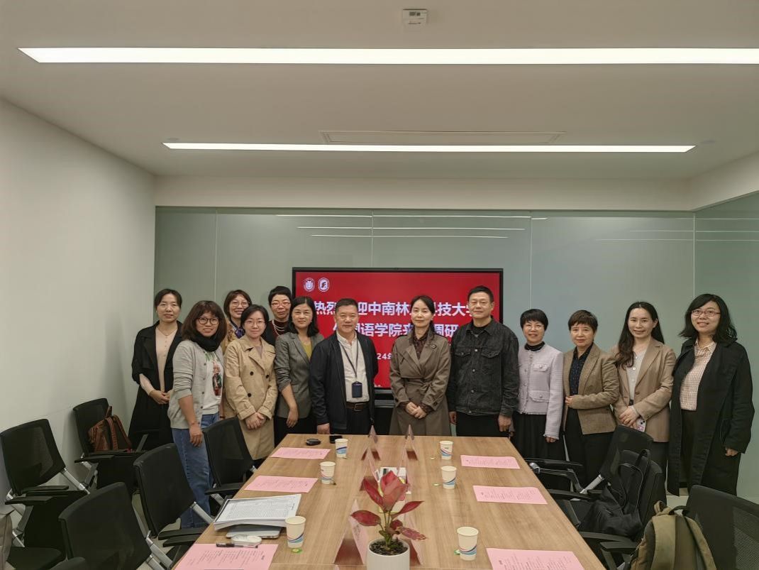 在交流讨论环节,中南林业科技大学外国语学院的领导和老师就英语专业培养特色、实践课程的设置与要求、海外交流学习等方面与参会老师进行了深入而热烈的讨论。双方还就MTI专业硕士研究生培养、应用翻译研究中心和海派文化国际传播研究中心的设置和管理等方面进行了交流。