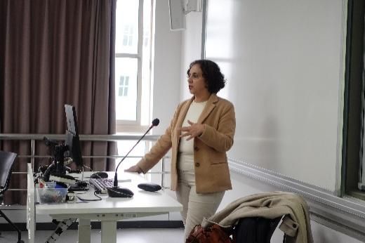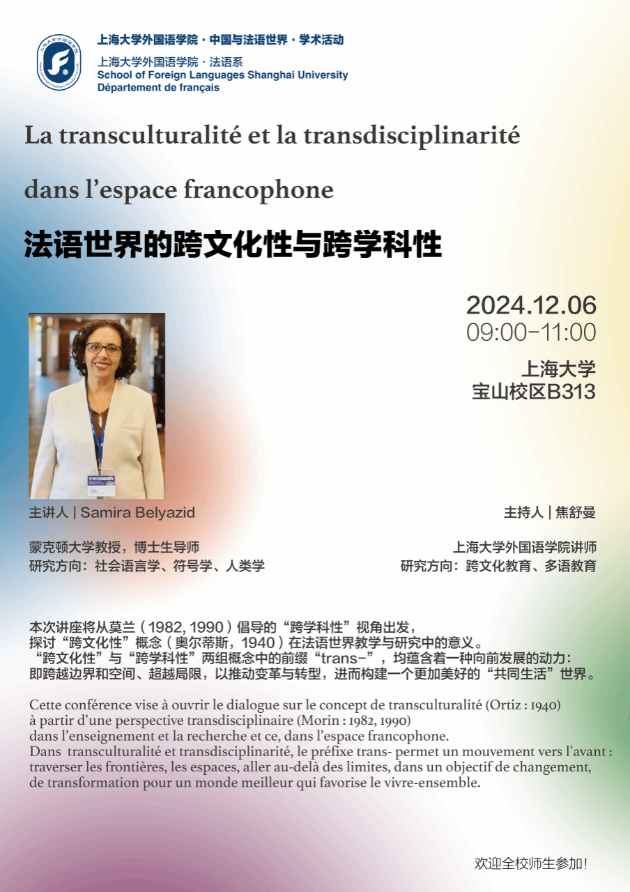 12月6日上午,外国语学院法语系在B313教室举办主题为“法语世界的跨文化性与跨学科性”的学术讲座。本次讲座邀请加拿大蒙克顿大学Samira Belyazid教授主讲,由法语系教师焦舒曼主持。