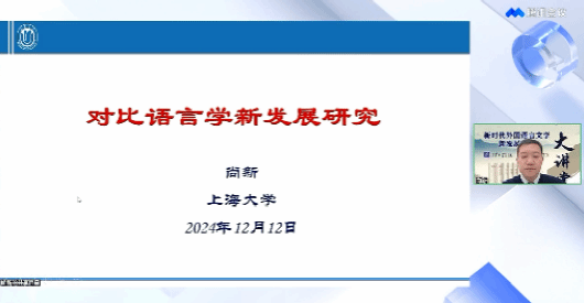 12月12日晚,尚新教授受邀开展“新时代外国语言文学新发展研究大讲堂”系列讲座,作题为“对比语言学新发展研究”的专题报告,来自中外高校及科研机构的外国语言文学领域的专家学者汇聚一堂,共同聆听了本场精彩纷呈的学术盛宴,讲座由上海海事大学外国语学院佟和龙教授主持。