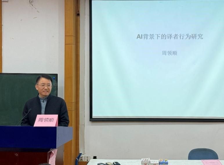 第一位发言人是来自扬州大学的周领顺教授,他发言的题目是“AI背景下的译者行为研究”。在人工智能(AI)技术飞速发展的时代背景下,周教授回应了译者行为研究该怎样开展这一学界关注的问题。周教授认为人译者与机译者根本的区别在于有无意志性及其统领的语言性和社会性,译者行为研究是以人为本的互动关系研究,明确这一点有助于从微观的角度看清翻译活动中机译者和人译者各自的优劣,以便在对比中达到创新思维、更新研究方法、增强理论的解释力并加强“翻译外”研究的目的,直至在宏观上深化翻译本体研究和翻译批评,使人译者行为研究和机译者行为研究在对比中实现互补性发展。
