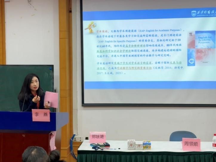 第四位发言人是西安外国语大学的李燕教授,她的题目是“英语学术论文写作:体裁与语言”。李教授认为学术话语能力不仅体现在词句正确的写作功底,更重要的是建立在符合学科范式的文本能力、贯通文脉的体裁能力以及与学科共同体有效对话的社会语境能力。李教授以学术英语、学术话语能力为出发点,阐释了基于体裁的英语学术论文写作,分析了学术写作中的语言学属性,旨在提升写作者的体裁意识与修辞能力,强化学术写作的逻辑性与表达的学术性,更好地服务于学科交流与知识传播。