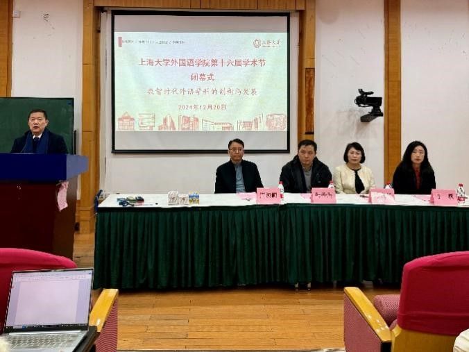 2024年12月20日下午,上海大学外国语言文学第十六届学术节闭幕式于宝山校区J楼201厅顺利举办,标志着为期两个月的学术节落下帷幕。本次闭幕式主题为“数智时代外语学科的创新与发展”,特别邀请了扬州大学的周领顺教授、上海外国语大学的韩子满教授、复旦大学的郑咏滟教授和西安外国语大学李燕教授四位专家作主旨报告。外国语学院党委书记吴蔚、党委副书记、院长尚新、副院长、副书记贾小琴、副院长戴朝晖、副院长唐青叶、副院长张建琴以及100余名师生参会。主旨报告分别由院长尚新教授和副院长唐青叶教授主持。