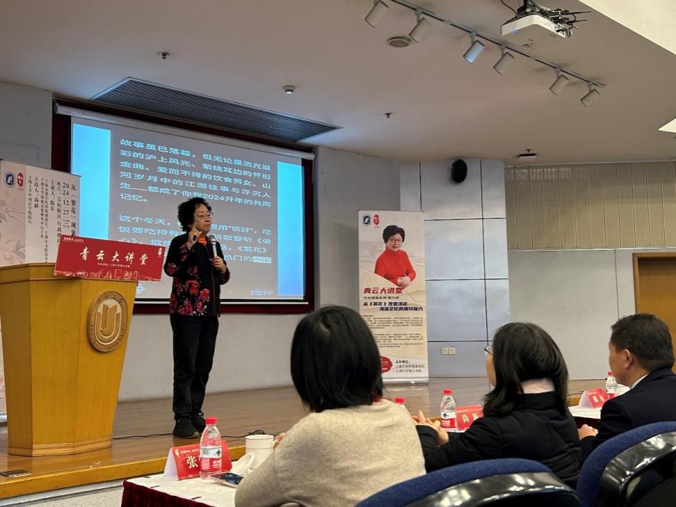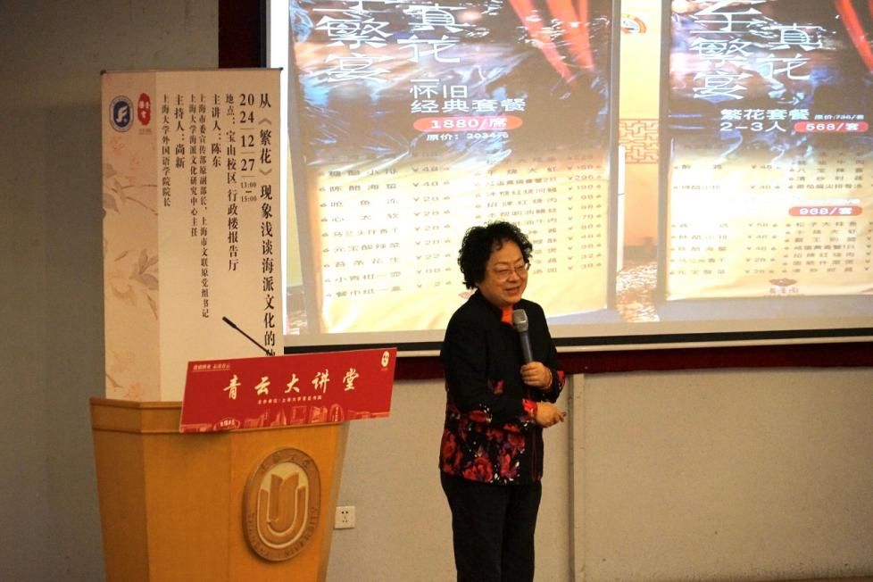 讲座中,陈老师结合个人工作经历,分享了音乐剧《辅德里》、话剧《雷雨》、《千里江山图》、舞剧《朱鹮》等经典剧作中的海派文化精神。她还从上海大学博物馆的旗袍服饰、沪语博物馆的沪语发音、上海“四大金刚”的饮食习惯、上海交通状况的变迁等方面,剖析了上海海派文化精神的内涵。
