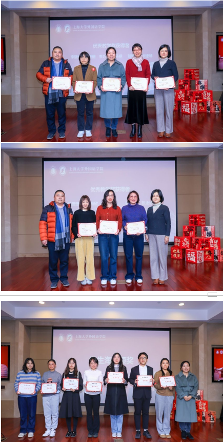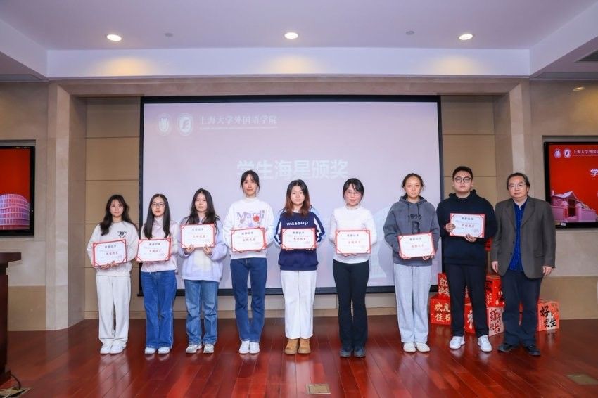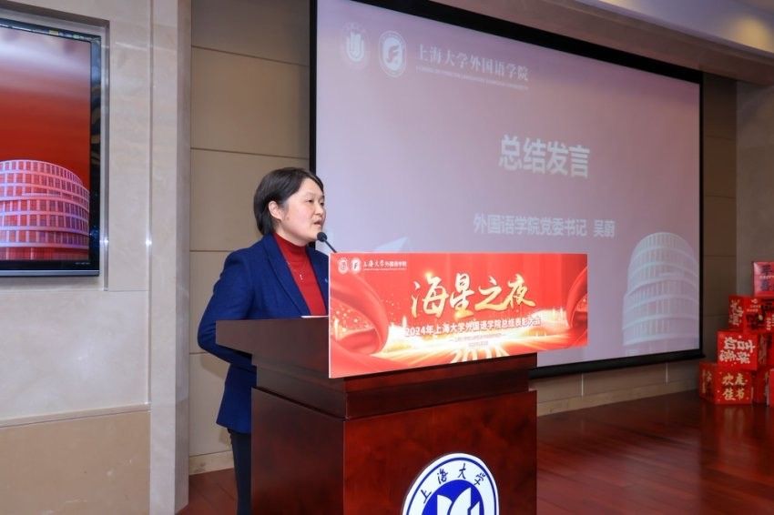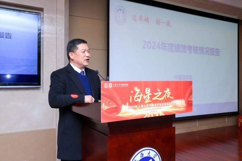 回首过往,擘画新程。奋楫争先,勇毅笃行。2025年1月3日下午,上海大学外国语学院在宝山校区乐乎新楼学海厅举办2024年度“海星之夜”总结表彰大会。外国语学院老领导谢之君、施雯、邓志勇,学院党委书记吴蔚,党委副书记、院长尚新,党委副书记、副院长贾小琴,副院长戴朝晖、唐青叶、张建琴,学院各系部主任、学院教职工和学生代表齐聚一堂,共赴盛会。本次大会由外国语学院本科生邓修杰、王语薇和研究生李峥赫、王玉琪主持。