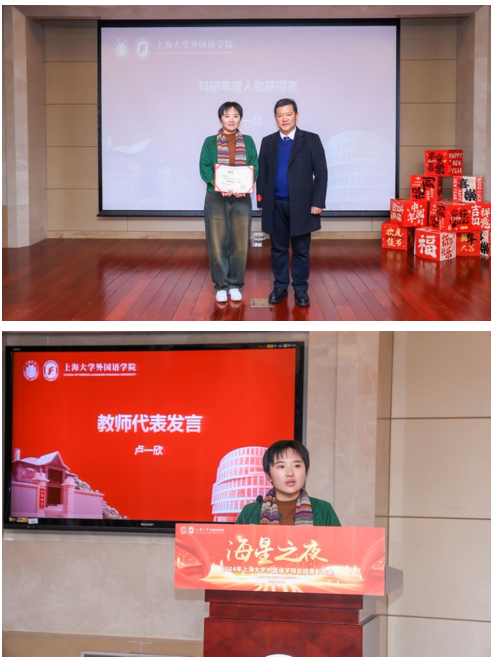 接下来,尚新院长为卢一欣老师颁发科研年度人物奖,表彰其于学术之途的斐然佳绩,在科研征程中锲而不舍、坚持不懈、笃实严谨的学术精神。随后,教师代表卢一欣老师上台发言,她表示作为一名青年教师,感谢学院领导与各位老师的支持与帮助,将继续保持对科研学术的热爱与执着,激发学生的学术兴趣,推动学院科研事业的发展。