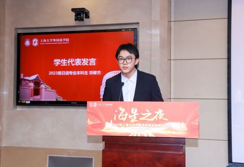 颁奖过后,由学生代表2023级日语专业本科生邓修杰发言。他分享了大学阶段的学习经验和心得,为同学们提供了具有深远参考价值的学习方法和建议。