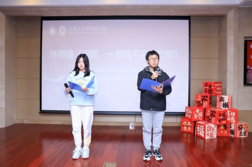 颁奖之后,2024级英语专业本科生李嘉欣、李博文同学带来诗朗诵《祖国,一首唱不完的恋歌》,以深沉而热烈的情感,抒发对祖国的热爱和对未来的展望。