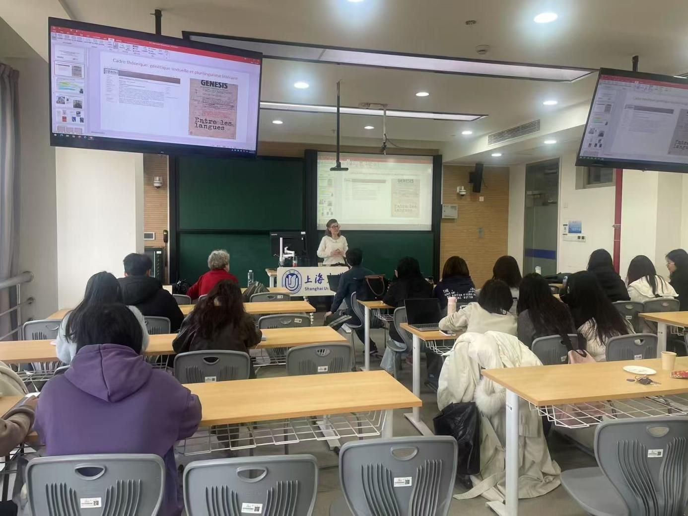 讲座由法语系顾晓毅博士主持;法语系副主任向维维副教授、赵倩博士、中欧工程师学院法方副院长Laure Minassian副教授、金闪闪、张少琼老师以及四十多位本硕同学参加。